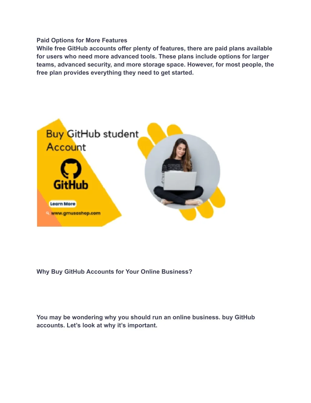 Paid Options for More Features While free GitHub accounts offer plenty of features, there are paid plans available for users who need more advanced tools. These plans include options for larger teams, advanced security, and more storage space. However, for most people, the free plan provides everything they need to get started. Why Buy GitHub Accounts for Your Online Business? You may be wondering why you should run an online business. buy GitHub accounts. Let’s look at why it’s important.