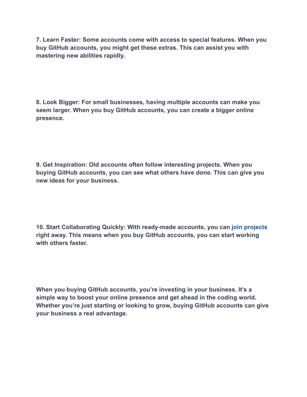 7. Learn Faster: Some accounts come with access to special features. When you buy GitHub accounts, you might get these extras. This can assist you with mastering new abilities rapidly. 8. Look Bigger: For small businesses, having multiple accounts can make you seem larger. When you buy GitHub accounts, you can create a bigger online presence. 9. Get Inspiration: Old accounts often follow interesting projects. When you buying GitHub accounts, you can see what others have done. This can give you new ideas for your business. 10. Start Collaborating Quickly: With ready-made accounts, you can join projects right away. This means when you buy GitHub accounts, you can start working with others faster. When you buying GitHub accounts, you’re investing in your business. It’s a simple way to boost your online presence and get ahead in the coding world. Whether you’re just starting or looking to grow, buying GitHub accounts can give your business a real advantage.