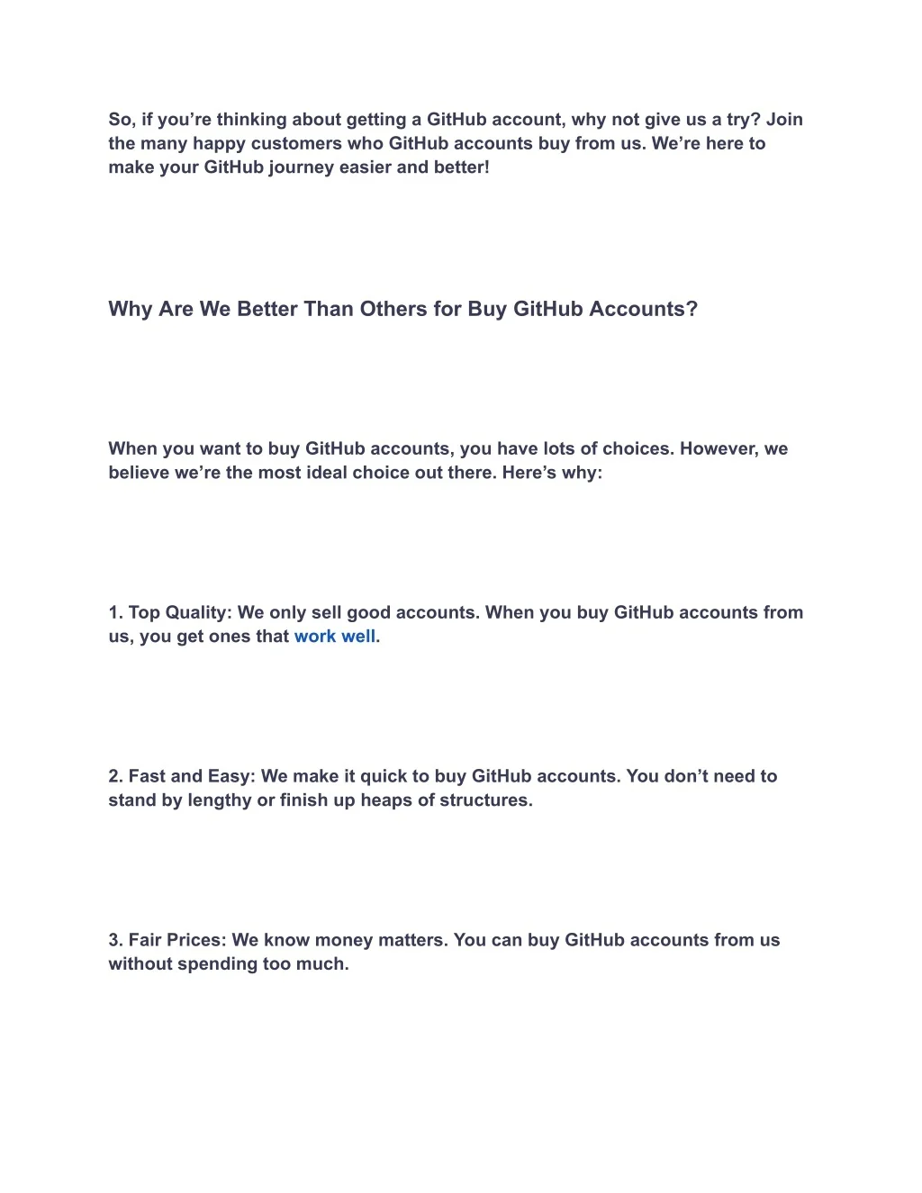 So, if you’re thinking about getting a GitHub account, why not give us a try? Join the many happy customers who GitHub accounts buy from us. We’re here to make your GitHub journey easier and better! Why Are We Better Than Others for Buy GitHub Accounts? When you want to buy GitHub accounts, you have lots of choices. However, we believe we’re the most ideal choice out there. Here’s why: 1. Top Quality: We only sell good accounts. When you buy GitHub accounts from us, you get ones that work well. 2. Fast and Easy: We make it quick to buy GitHub accounts. You don’t need to stand by lengthy or finish up heaps of structures. 3. Fair Prices: We know money matters. You can buy GitHub accounts from us without spending too much.