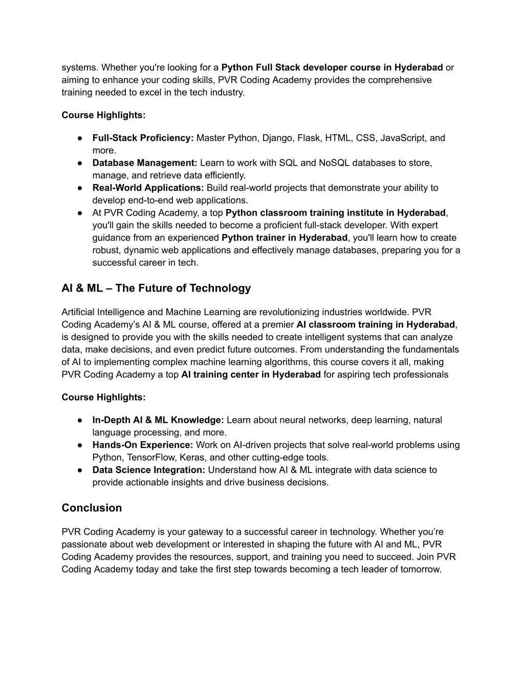 systems. Whether you're looking for a Python Full Stack developer course in Hyderabad or aiming to enhance your coding skills, PVR Coding Academy provides the comprehensive training needed to excel in the tech industry. Course Highlights: ● Full-Stack Proficiency: Master Python, Django, Flask, HTML, CSS, JavaScript, and more. Database Management: Learn to work with SQL and NoSQL databases to store, manage, and retrieve data efficiently. Real-World Applications: Build real-world projects that demonstrate your ability to develop end-to-end web applications. At PVR Coding Academy, a top Python classroom training institute in Hyderabad, you'll gain the skills needed to become a proficient full-stack developer. With expert guidance from an experienced Python trainer in Hyderabad, you'll learn how to create robust, dynamic web applications and effectively manage databases, preparing you for a successful career in tech. ● ● ● AI & ML – The Future of Technology Artificial Intelligence and Machine Learning are revolutionizing industries worldwide. PVR Coding Academy’s AI & ML course, offered at a premier AI classroom training in Hyderabad, is designed to provide you with the skills needed to create intelligent systems that can analyze data, make decisions, and even predict future outcomes. From understanding the fundamentals of AI to implementing complex machine learning algorithms, this course covers it all, making PVR Coding Academy a top AI training center in Hyderabad for aspiring tech professionals Course Highlights: ● In-Depth AI & ML Knowledge: Learn about neural networks, deep learning, natural language processing, and more. Hands-On Experience: Work on AI-driven projects that solve real-world problems using Python, TensorFlow, Keras, and other cutting-edge tools. Data Science Integration: Understand how AI & ML integrate with data science to provide actionable insights and drive business decisions. ● ● Conclusion PVR Coding Academy is your gateway to a successful career in technology. Whether you’re passionate about web development or interested in shaping the future with AI and ML, PVR Coding Academy provides the resources, support, and training you need to succeed. Join PVR Coding Academy today and take the first step towards becoming a tech leader of tomorrow.