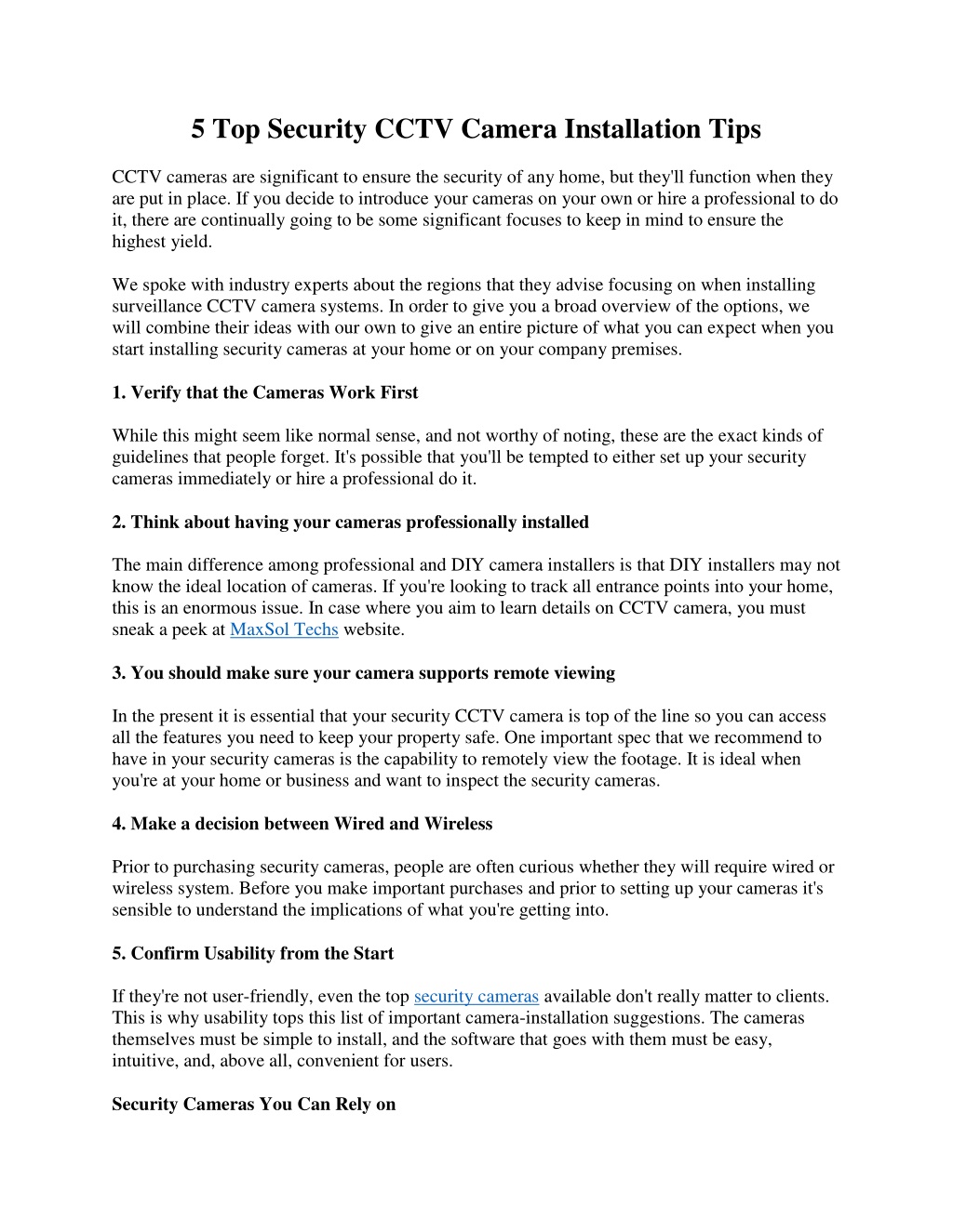 5 Top Security CCTV Camera Installation Tips CCTV cameras are significant to ensure the security of any home, but they'll function when they are put in place. If you decide to introduce your cameras on your own or hire a professional to do it, there are continually going to be some significant focuses to keep in mind to ensure the highest yield. We spoke with industry experts about the regions that they advise focusing on when installing surveillance CCTV camera systems. In order to give you a broad overview of the options, we will combine their ideas with our own to give an entire picture of what you can expect when you start installing security cameras at your home or on your company premises. 1. Verify that the Cameras Work First While this might seem like normal sense, and not worthy of noting, these are the exact kinds of guidelines that people forget. It's possible that you'll be tempted to either set up your security cameras immediately or hire a professional do it. 2. Think about having your cameras professionally installed The main difference among professional and DIY camera installers is that DIY installers may not know the ideal location of cameras. If you're looking to track all entrance points into your home, this is an enormous issue. In case where you aim to learn details on CCTV camera, you must sneak a peek at MaxSol Techs website. 3. You should make sure your camera supports remote viewing In the present it is essential that your security CCTV camera is top of the line so you can access all the features you need to keep your property safe. One important spec that we recommend to have in your security cameras is the capability to remotely view the footage. It is ideal when you're at your home or business and want to inspect the security cameras. 4. Make a decision between Wired and Wireless Prior to purchasing security cameras, people are often curious whether they will require wired or wireless system. Before you make important purchases and prior to setting up your cameras it's sensible to understand the implications of what you're getting into. 5. Confirm Usability from the Start If they're not user-friendly, even the top security cameras available don't really matter to clients. This is why usability tops this list of important camera-installation suggestions. The cameras themselves must be simple to install, and the software that goes with them must be easy, intuitive, and, above all, convenient for users. Security Cameras You Can Rely on