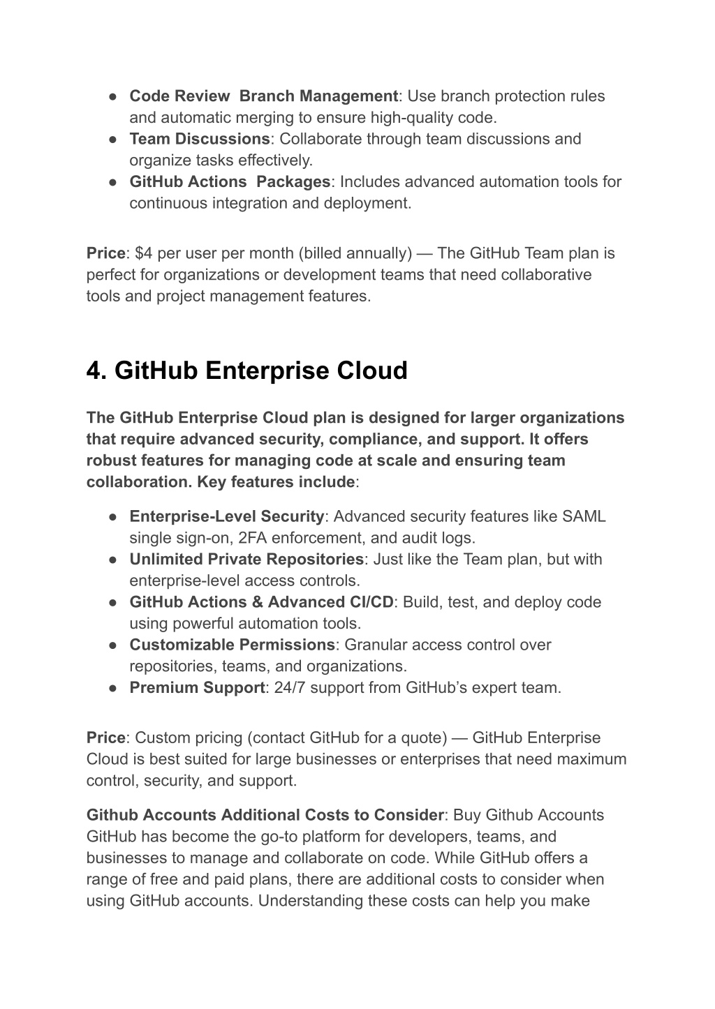6. ● Code Review Branch Management: Use branch protection rules and automatic merging to ensure high-quality code. ● Team Discussions: Collaborate through team discussions and organize tasks effectively. ● GitHub Actions Packages: Includes advanced automation tools for continuous integration and deployment. Price: $4 per user per month (billed annually) — The GitHub Team plan is perfect for organizations or development teams that need collaborative tools and project management features. 4. GitHub Enterprise Cloud The GitHub Enterprise Cloud plan is designed for larger organizations that require advanced security, compliance, and support. It offers robust features for managing code at scale and ensuring team collaboration. Key features include: ● Enterprise-Level Security: Advanced security features like SAML single sign-on, 2FA enforcement, and audit logs. ● Unlimited Private Repositories: Just like the Team plan, but with enterprise-level access controls. ● GitHub Actions & Advanced CI/CD: Build, test, and deploy code using powerful automation tools. ● Customizable Permissions: Granular access control over repositories, teams, and organizations. ● Premium Support: 24/7 support from GitHub’s expert team. Price: Custom pricing (contact GitHub for a quote) — GitHub Enterprise Cloud is best suited for large businesses or enterprises that need maximum control, security, and support. Github Accounts Additional Costs to Consider: Buy Github Accounts GitHub has become the go-to platform for developers, teams, and businesses to manage and collaborate on code. While GitHub offers a range of free and paid plans, there are additional costs to consider when using GitHub accounts. Understanding these costs can help you make