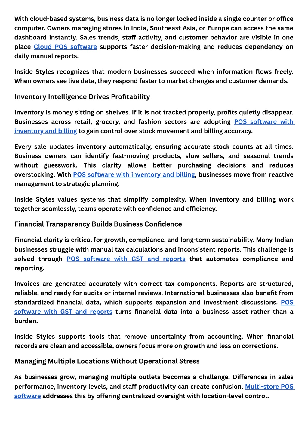 2. With cloud-based systems, business data is no longer locked inside a single counter or office computer. Owners managing stores in India, Southeast Asia, or Europe can access the same dashboard instantly. Sales trends, staff activity, and customer behavior are visible in one place Cloud POS software supports faster decision-making and reduces dependency on daily manual reports. Inside Styles recognizes that modern businesses succeed when information flows freely. When owners see live data, they respond faster to market changes and customer demands. Inventory Intelligence Drives Profitability Inventory is money sitting on shelves. If it is not tracked properly, profits quietly disappear. Businesses across retail, grocery, and fashion sectors are adopting POS software with inventory and billing to gain control over stock movement and billing accuracy. Every sale updates inventory automatically, ensuring accurate stock counts at all times. Business owners can identify fast-moving products, slow sellers, and seasonal trends without guesswork. This clarity allows better purchasing decisions and reduces overstocking. With POS software with inventory and billing, businesses move from reactive management to strategic planning. Inside Styles values systems that simplify complexity. When inventory and billing work together seamlessly, teams operate with confidence and efficiency. Financial Transparency Builds Business Confidence Financial clarity is critical for growth, compliance, and long-term sustainability. Many Indian businesses struggle with manual tax calculations and inconsistent reports. This challenge is solved through POS software with GST and reports that automates compliance and reporting. Invoices are generated accurately with correct tax components. Reports are structured, reliable, and ready for audits or internal reviews. International businesses also benefit from standardized financial data, which supports expansion and investment discussions. POS software with GST and reports turns financial data into a business asset rather than a burden. Inside Styles supports tools that remove uncertainty from accounting. When financial records are clean and accessible, owners focus more on growth and less on corrections. Managing Multiple Locations Without Operational Stress As businesses grow, managing multiple outlets becomes a challenge. Differences in sales performance, inventory levels, and staff productivity can create confusion. Multi-store POS software addresses this by offering centralized oversight with location-level control.