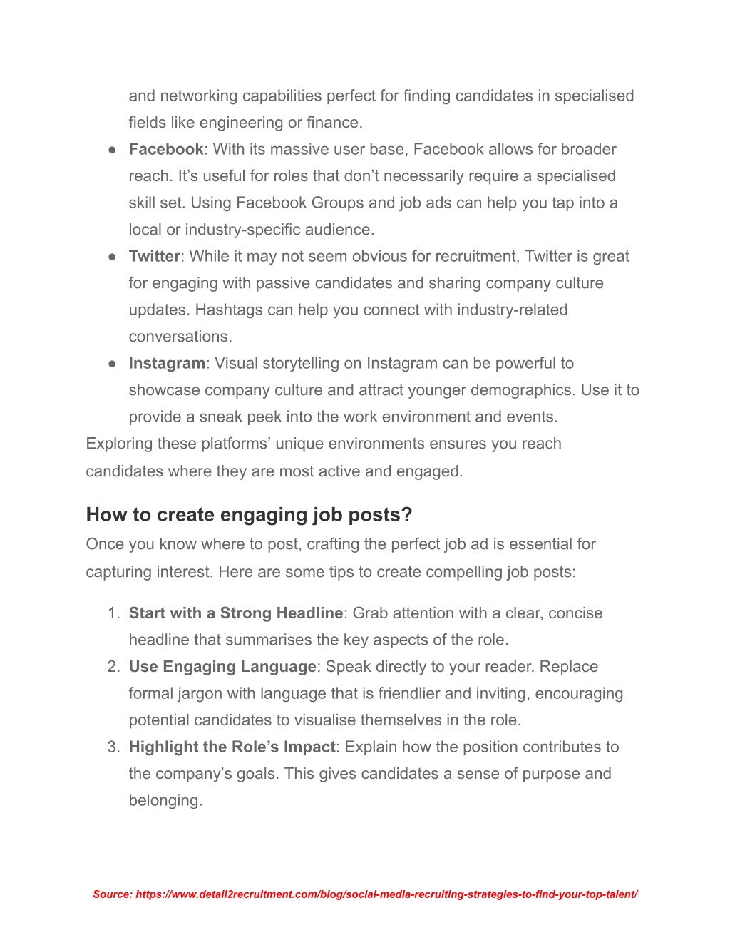 and networking capabilities perfect for finding candidates in specialised fields like engineering or finance. ● Facebook: With its massive user base, Facebook allows for broader reach. It’s useful for roles that don’t necessarily require a specialised skill set. Using Facebook Groups and job ads can help you tap into a local or industry-specific audience. ● Twitter: While it may not seem obvious for recruitment, Twitter is great for engaging with passive candidates and sharing company culture updates. Hashtags can help you connect with industry-related conversations. ● Instagram: Visual storytelling on Instagram can be powerful to showcase company culture and attract younger demographics. Use it to provide a sneak peek into the work environment and events. Exploring these platforms’ unique environments ensures you reach candidates where they are most active and engaged. How to create engaging job posts? Once you know where to post, crafting the perfect job ad is essential for capturing interest. Here are some tips to create compelling job posts: 1. Start with a Strong Headline: Grab attention with a clear, concise headline that summarises the key aspects of the role. 2. Use Engaging Language: Speak directly to your reader. Replace formal jargon with language that is friendlier and inviting, encouraging potential candidates to visualise themselves in the role. 3. Highlight the Role’s Impact: Explain how the position contributes to the company’s goals. This gives candidates a sense of purpose and belonging. Source: https://www.detail2recruitment.com/blog/social-media-recruiting-strategies-to-find-your-top-talent/