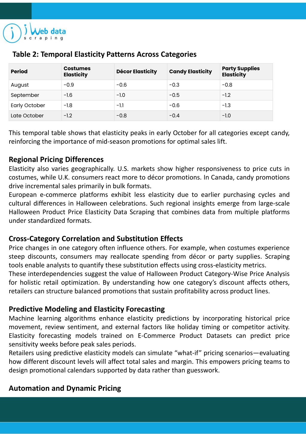 Table 2: Temporal Elasticity Patterns Across Categories Costumes Elasticity Party Supplies Elasticity Period Décor Elasticity Candy Elasticity August -0.9 -0.6 -0.3 -0.8 September -1.6 -1.0 -0.5 -1.2 Early October -1.8 -1.1 -0.6 -1.3 Late October -1.2 -0.8 -0.4 -1.0 This temporal table shows that elasticity peaks in early October for all categories except candy, reinforcing the importance of mid-season promotions for optimal sales lift. Regional Pricing Differences Elasticity also varies geographically. U.S. markets show higher responsiveness to price cuts in costumes, while U.K. consumers react more to décor promotions. In Canada, candy promotions drive incremental sales primarily in bulk formats. European e-commerce platforms exhibit less elasticity due to earlier purchasing cycles and cultural differences in Halloween celebrations. Such regional insights emerge from large-scale Halloween Product Price Elasticity Data Scraping that combines data from multiple platforms under standardized formats. Cross-Category Correlation and Substitution Effects Price changes in one category often influence others. For example, when costumes experience steep discounts, consumers may reallocate spending from décor or party supplies. Scraping tools enable analysts to quantify these substitution effects using cross-elasticity metrics. These interdependencies suggest the value of Halloween Product Category-Wise Price Analysis for holistic retail optimization. By understanding how one category’s discount affects others, retailers can structure balanced promotions that sustain profitability across product lines. Predictive Modeling and Elasticity Forecasting Machine learning algorithms enhance elasticity predictions by incorporating historical price movement, review sentiment, and external factors like holiday timing or competitor activity. Elasticity forecasting models trained on E-Commerce Product Datasets can predict price sensitivity weeks before peak sales periods. Retailers using predictive elasticity models can simulate “what-if” pricing scenarios—evaluating how different discount levels will affect total sales and margin. This empowers pricing teams to design promotional calendars supported by data rather than guesswork. Automation and Dynamic Pricing