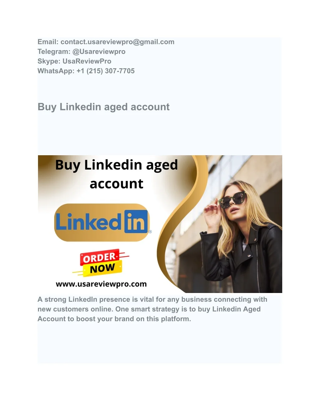 Email: contact.usareviewpro@gmail.com Telegram: @Usareviewpro Skype: UsaReviewPro WhatsApp: +1 (215) 307-7705 Buy Linkedin aged account A strong LinkedIn presence is vital for any business connecting with new customers online. One smart strategy is to buy Linkedin Aged Account to boost your brand on this platform.