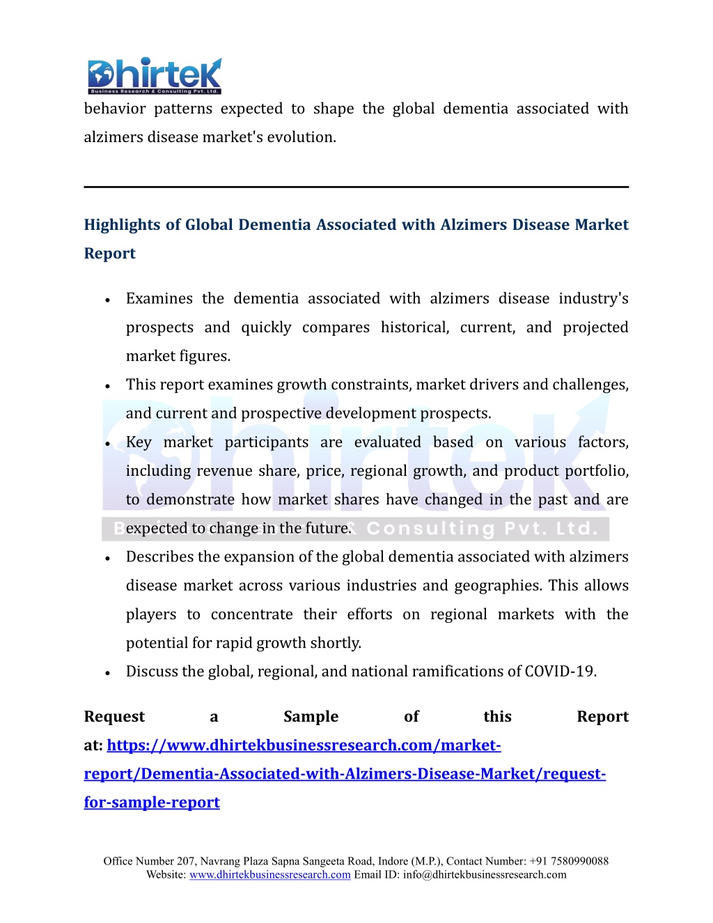 behavior patterns expected to shape the global dementia associated with alzimers disease market's evolution. Highlights of Global Dementia Associated with Alzimers Disease Market Report Examines the dementia associated with alzimers disease industry's prospects and quickly compares historical, current, and projected market figures. This report examines growth constraints, market drivers and challenges, and current and prospective development prospects. Key market participants are evaluated based on various factors, including revenue share, price, regional growth, and product portfolio, to demonstrate how market shares have changed in the past and are expected to change in the future. Describes the expansion of the global dementia associated with alzimers disease market across various industries and geographies. This allows players to concentrate their efforts on regional markets with the potential for rapid growth shortly. Discuss the global, regional, and national ramifications of COVID-19. Request a Sample of this Report at: https://www.dhirtekbusinessresearch.com/market- report/Dementia-Associated-with-Alzimers-Disease-Market/request- for-sample-report Office Number 207, Navrang Plaza Sapna Sangeeta Road, Indore (M.P.), Contact Number: +91 7580990088 Website:www.dhirtekbusinessresearch.com Email ID: info@dhirtekbusinessresearch.com
