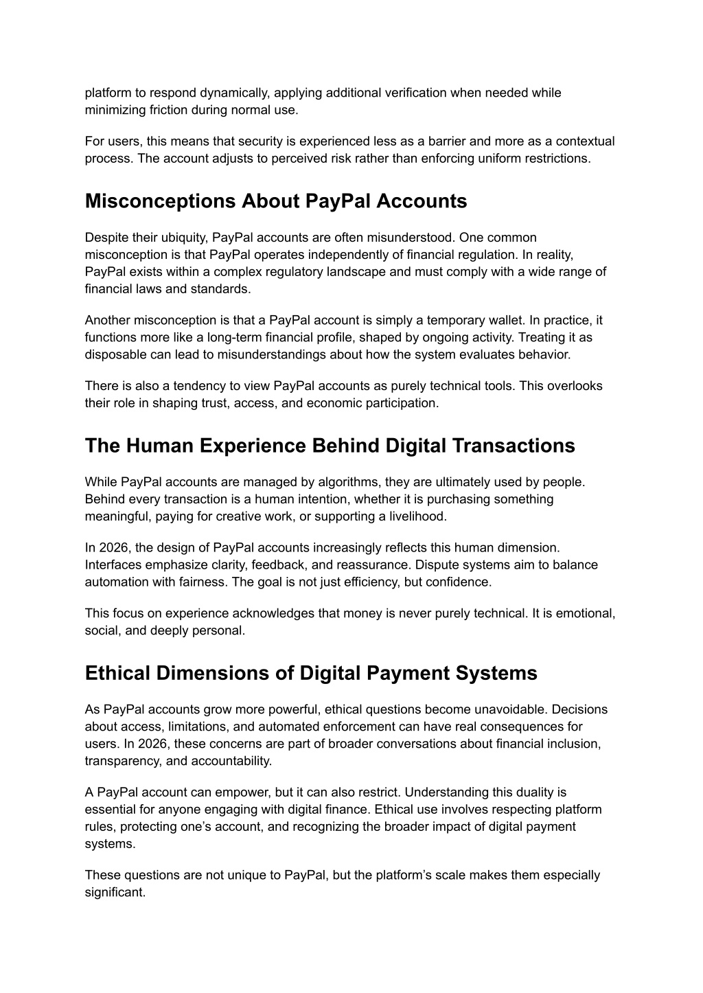 platform to respond dynamically, applying additional verification when needed while minimizing friction during normal use. For users, this means that security is experienced less as a barrier and more as a contextual process. The account adjusts to perceived risk rather than enforcing uniform restrictions. Misconceptions About PayPal Accounts Despite their ubiquity, PayPal accounts are often misunderstood. One common misconception is that PayPal operates independently of financial regulation. In reality, PayPal exists within a complex regulatory landscape and must comply with a wide range of financial laws and standards. Another misconception is that a PayPal account is simply a temporary wallet. In practice, it functions more like a long-term financial profile, shaped by ongoing activity. Treating it as disposable can lead to misunderstandings about how the system evaluates behavior. There is also a tendency to view PayPal accounts as purely technical tools. This overlooks their role in shaping trust, access, and economic participation. The Human Experience Behind Digital Transactions While PayPal accounts are managed by algorithms, they are ultimately used by people. Behind every transaction is a human intention, whether it is purchasing something meaningful, paying for creative work, or supporting a livelihood. In 2026, the design of PayPal accounts increasingly reflects this human dimension. Interfaces emphasize clarity, feedback, and reassurance. Dispute systems aim to balance automation with fairness. The goal is not just efficiency, but confidence. This focus on experience acknowledges that money is never purely technical. It is emotional, social, and deeply personal. Ethical Dimensions of Digital Payment Systems As PayPal accounts grow more powerful, ethical questions become unavoidable. Decisions about access, limitations, and automated enforcement can have real consequences for users. In 2026, these concerns are part of broader conversations about financial inclusion, transparency, and accountability. A PayPal account can empower, but it can also restrict. Understanding this duality is essential for anyone engaging with digital finance. Ethical use involves respecting platform rules, protecting one’s account, and recognizing the broader impact of digital payment systems. These questions are not unique to PayPal, but the platform’s scale makes them especially significant.