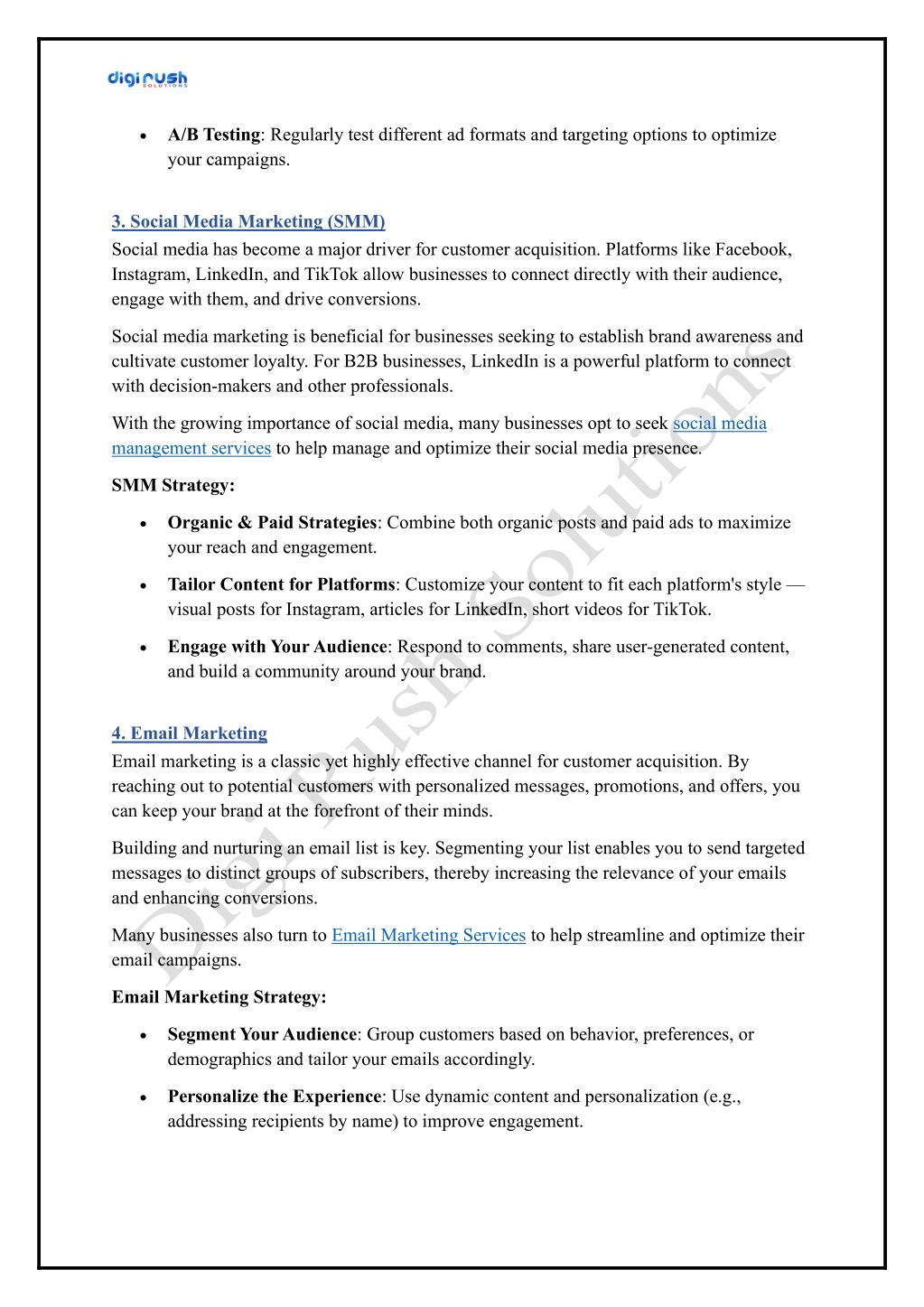•A/B Testing: Regularly test different ad formats and targeting options to optimize your campaigns. 3. Social Media Marketing (SMM) Social media has become a major driver for customer acquisition. Platforms like Facebook, Instagram, LinkedIn, and TikTok allow businesses to connect directly with their audience, engage with them, and drive conversions. Social media marketing is beneficial for businesses seeking to establish brand awareness and cultivate customer loyalty. For B2B businesses, LinkedIn is a powerful platform to connect with decision-makers and other professionals. With the growing importance of social media, many businesses opt to seeksocial media management servicesto help manage and optimize their social media presence. SMM Strategy: •Organic & Paid Strategies: Combine both organic posts and paid ads to maximize your reach and engagement. •Tailor Content for Platforms: Customize your content to fit each platform's style — visual posts for Instagram, articles for LinkedIn, short videos for TikTok. •Engage with Your Audience: Respond to comments, share user-generated content, and build a community around your brand. 4. Email Marketing Email marketing is a classic yet highly effective channel for customer acquisition. By reaching out to potential customers with personalized messages, promotions, and offers, you can keep your brand at the forefront of their minds. Building and nurturing an email list is key. Segmenting your list enables you to send targeted messages to distinct groups of subscribers, thereby increasing the relevance of your emails and enhancing conversions. Many businesses also turn toEmail Marketing Servicesto help streamline and optimize their email campaigns. Email Marketing Strategy: •Segment Your Audience: Group customers based on behavior, preferences, or demographics and tailor your emails accordingly. •Personalize the Experience: Use dynamic content and personalization (e.g., addressing recipients by name) to improve engagement.