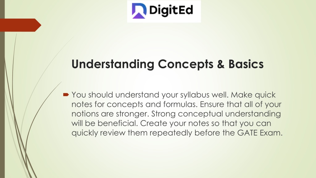 Understanding Concepts & Basics • You should understand your syllabus well. Make quick notes for concepts and formulas. Ensure that all of your notions are stronger. Strong conceptual understanding will be beneficial. Create your notes so that you can quickly review them repeatedly before the GATE Exam.