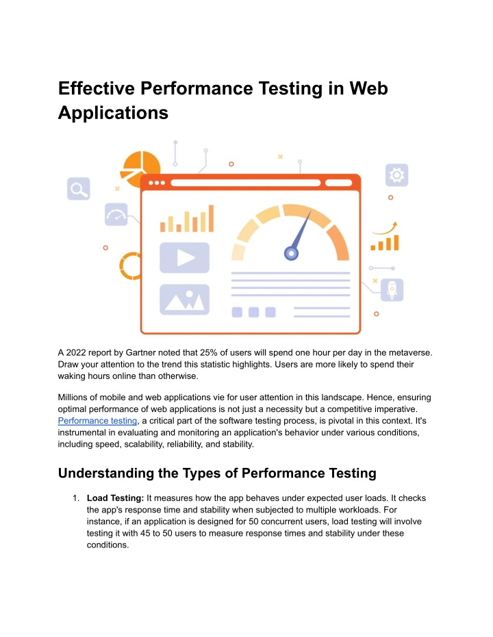 Effective Performance Testing in Web Applications A 2022 report by Gartner noted that 25% of users will spend one hour per day in the metaverse. Draw your attention to the trend this statistic highlights. Users are more likely to spend their waking hours online than otherwise. Millions of mobile and web applications vie for user attention in this landscape. Hence, ensuring optimal performance of web applications is not just a necessity but a competitive imperative . Performance testing, a critical part of the software testing process, is pivotal in this context. It's instrumental in evaluating and monitoring an application's behavior under various conditions, including speed, scalability, reliability, and stability . Understanding the Types of Performance Testing 1. Load Testing: It measures how the app behaves under expected user loads. It checks the app's response time and stability when subjected to multiple workloads. For instance, if an application is designed for 50 concurrent users, load testing will involve testing it with 45 to 50 users to measure response times and stability under these conditions .