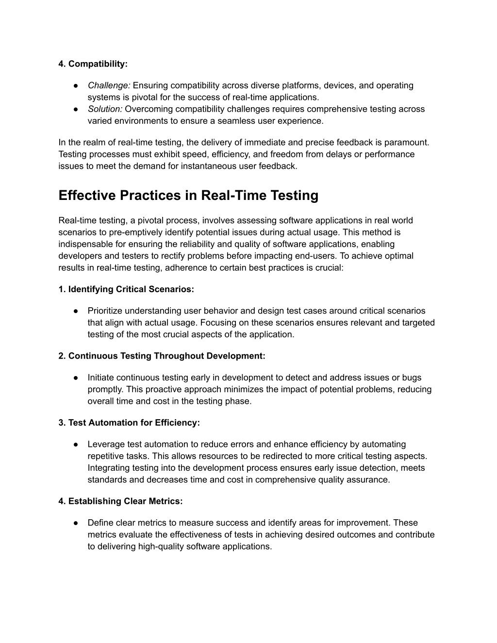 4. Compatibility: ● Challenge: Ensuring compatibility across diverse platforms, devices, and operating systems is pivotal for the success of real-time applications. ● Solution: Overcoming compatibility challenges requires comprehensive testing across varied environments to ensure a seamless user experience. In the realm of real-time testing, the delivery of immediate and precise feedback is paramount. Testing processes must exhibit speed, efficiency, and freedom from delays or performance issues to meet the demand for instantaneous user feedback. Effective Practices in Real-Time Testing Real-time testing, a pivotal process, involves assessing software applications in real world scenarios to pre-emptively identify potential issues during actual usage. This method is indispensable for ensuring the reliability and quality of software applications, enabling developers and testers to rectify problems before impacting end-users. To achieve optimal results in real-time testing, adherence to certain best practices is crucial: 1. Identifying Critical Scenarios: ● Prioritize understanding user behavior and design test cases around critical scenarios that align with actual usage. Focusing on these scenarios ensures relevant and targeted testing of the most crucial aspects of the application. 2. Continuous Testing Throughout Development: ● Initiate continuous testing early in development to detect and address issues or bugs promptly. This proactive approach minimizes the impact of potential problems, reducing overall time and cost in the testing phase. 3. Test Automation for Efficiency: ● Leverage test automation to reduce errors and enhance efficiency by automating repetitive tasks. This allows resources to be redirected to more critical testing aspects. Integrating testing into the development process ensures early issue detection, meets standards and decreases time and cost in comprehensive quality assurance. 4. Establishing Clear Metrics: ● Define clear metrics to measure success and identify areas for improvement. These metrics evaluate the effectiveness of tests in achieving desired outcomes and contribute to delivering high-quality software applications.