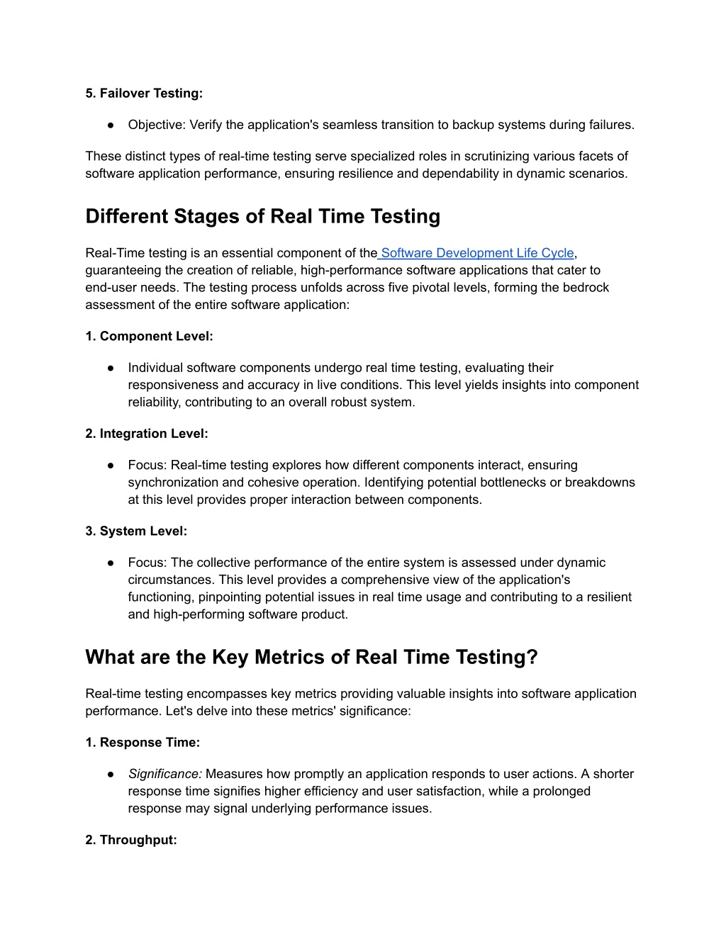 5. Failover Testing: ● Objective: Verify the application's seamless transition to backup systems during failures. These distinct types of real-time testing serve specialized roles in scrutinizing various facets of software application performance, ensuring resilience and dependability in dynamic scenarios. Different Stages of Real Time Testing Real-Time testing is an essential component of the Software Development Life Cycle, guaranteeing the creation of reliable, high-performance software applications that cater to end-user needs. The testing process unfolds across five pivotal levels, forming the bedrock assessment of the entire software application: 1. Component Level: ● Individual software components undergo real time testing, evaluating their responsiveness and accuracy in live conditions. This level yields insights into component reliability, contributing to an overall robust system. 2. Integration Level: ● Focus: Real-time testing explores how different components interact, ensuring synchronization and cohesive operation. Identifying potential bottlenecks or breakdowns at this level provides proper interaction between components. 3. System Level: ● Focus: The collective performance of the entire system is assessed under dynamic circumstances. This level provides a comprehensive view of the application's functioning, pinpointing potential issues in real time usage and contributing to a resilient and high-performing software product. What are the Key Metrics of Real Time Testing? Real-time testing encompasses key metrics providing valuable insights into software application performance. Let's delve into these metrics' significance: 1. Response Time: ● Significance: Measures how promptly an application responds to user actions. A shorter response time signifies higher efficiency and user satisfaction, while a prolonged response may signal underlying performance issues. 2. Throughput: