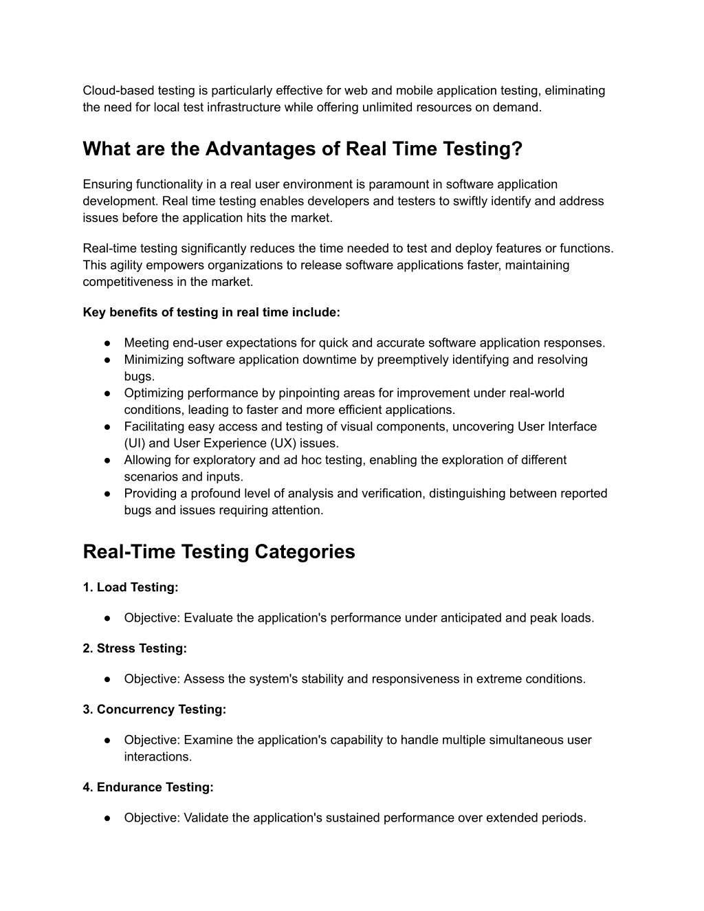 Cloud-based testing is particularly effective for web and mobile application testing, eliminating the need for local test infrastructure while offering unlimited resources on demand. What are the Advantages of Real Time Testing? Ensuring functionality in a real user environment is paramount in software application development. Real time testing enables developers and testers to swiftly identify and address issues before the application hits the market. Real-time testing significantly reduces the time needed to test and deploy features or functions. This agility empowers organizations to release software applications faster, maintaining competitiveness in the market. Key benefits of testing in real time include: ● Meeting end-user expectations for quick and accurate software application responses. ● Minimizing software application downtime by preemptively identifying and resolving bugs. ● Optimizing performance by pinpointing areas for improvement under real-world conditions, leading to faster and more efficient applications. ● Facilitating easy access and testing of visual components, uncovering User Interface (UI) and User Experience (UX) issues. ● Allowing for exploratory and ad hoc testing, enabling the exploration of different scenarios and inputs. ● Providing a profound level of analysis and verification, distinguishing between reported bugs and issues requiring attention. Real-Time Testing Categories 1. Load Testing: ● Objective: Evaluate the application's performance under anticipated and peak loads. 2. Stress Testing: ● Objective: Assess the system's stability and responsiveness in extreme conditions. 3. Concurrency Testing: ● Objective: Examine the application's capability to handle multiple simultaneous user interactions. 4. Endurance Testing: ● Objective: Validate the application's sustained performance over extended periods.