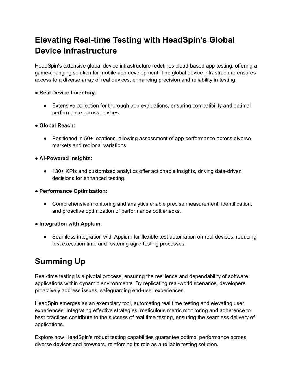 Elevating Real-time Testing with HeadSpin's Global Device Infrastructure HeadSpin's extensive global device infrastructure redefines cloud-based app testing, offering a game-changing solution for mobile app development. The global device infrastructure ensures access to a diverse array of real devices, enhancing precision and reliability in testing. ● Real Device Inventory: ● Extensive collection for thorough app evaluations, ensuring compatibility and optimal performance across devices. ● Global Reach: ● Positioned in 50+ locations, allowing assessment of app performance across diverse markets and regional variations. ● AI-Powered Insights: ● 130+ KPIs and customized analytics offer actionable insights, driving data-driven decisions for enhanced testing. ● Performance Optimization: ● Comprehensive monitoring and analytics enable precise measurement, identification, and proactive optimization of performance bottlenecks. ● Integration with Appium: ● Seamless integration with Appium for flexible test automation on real devices, reducing test execution time and fostering agile testing processes. Summing Up Real-time testing is a pivotal process, ensuring the resilience and dependability of software applications within dynamic environments. By replicating real-world scenarios, developers proactively address issues, safeguarding end-user experiences. HeadSpin emerges as an exemplary tool, automating real time testing and elevating user experiences. Integrating effective strategies, meticulous metric monitoring and adherence to best practices contribute to the success of real time testing, ensuring the seamless delivery of applications. Explore how HeadSpin's robust testing capabilities guarantee optimal performance across diverse devices and browsers, reinforcing its role as a reliable testing solution.