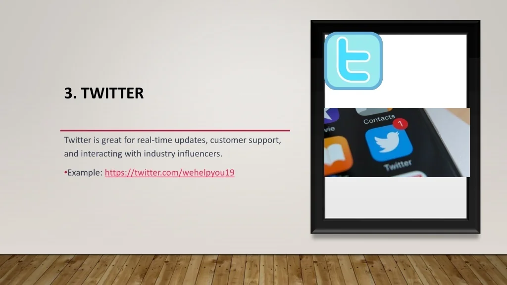 3. Twitter Twitter is great for real-time updates, customer support, and interacting with industry influencers. Example: https://twitter.com/wehelpyou19
