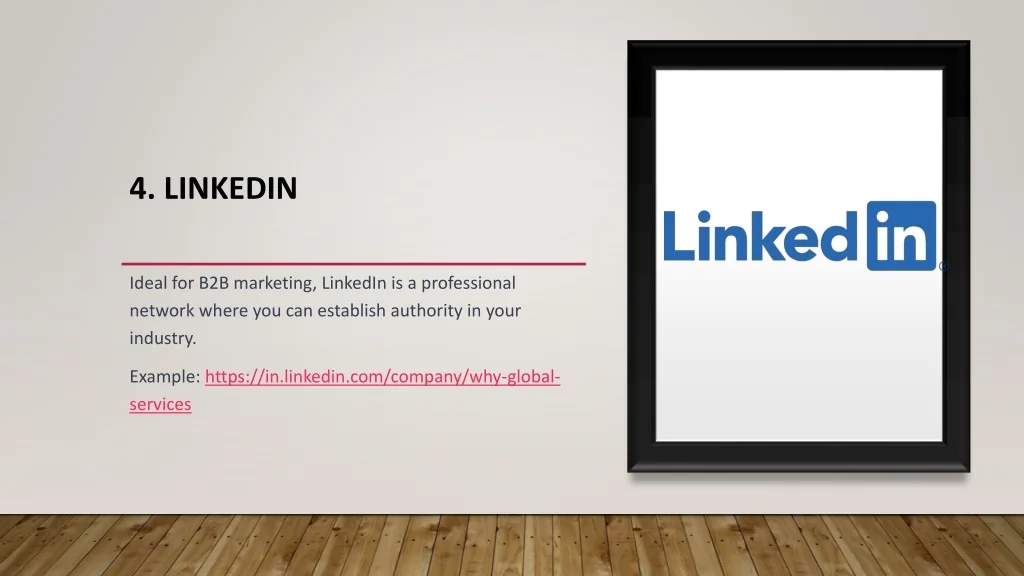 4. LinkedIn Ideal for B2B marketing, LinkedIn is a professional network where you can establish authority in your industry. Example: https://in.linkedin.com/company/why-global-services