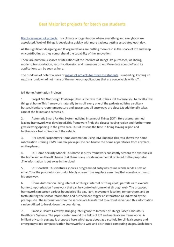 Btech cse major iot projects is a climate or organization where everything and everybody are associated. Web of Things is developing quickly with more gadgets getting associated each day.<br>All the significant designing and IT organizations are putting more cash in the space of IoT and keep on contributing as they comprehend the capability of the innovation.<br>There are numerous spaces of utilizations of the Internet of Things like purchaser, wellbeing, modern, transportation, security, diversion and numerous other. More data about IoT and its applications can be seen as here.<br>The rundown of pot
