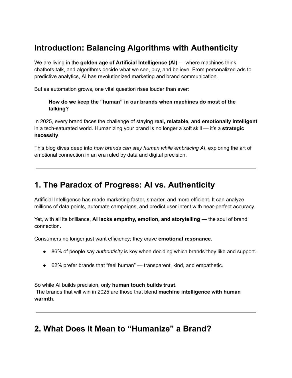 Introduction: Balancing Algorithms with Authenticity We are living in the golden age of Artificial Intelligence (AI) — where machines think, chatbots talk, and algorithms decide what we see, buy, and believe. From personalized ads to predictive analytics, AI has revolutionized marketing and brand communication. But as automation grows, one vital question rises louder than ever: How do we keep the “human” in our brands when machines do most of the talking? In 2025, every brand faces the challenge of staying real, relatable, and emotionally intelligent in a tech-saturated world. Humanizing your brand is no longer a soft skill — it’s a strategic necessity. This blog dives deep into how brands can stay human while embracing AI, exploring the art of emotional connection in an era ruled by data and digital precision. 1. The Paradox of Progress: AI vs. Authenticity Artificial Intelligence has made marketing faster, smarter, and more efficient. It can analyze millions of data points, automate campaigns, and predict user intent with near-perfect accuracy. Yet, with all its brilliance, AI lacks empathy, emotion, and storytelling — the soul of brand connection. Consumers no longer just want efficiency; they crave emotional resonance. ● 86% of people say authenticity is key when deciding which brands they like and support. ● 62% prefer brands that “feel human” — transparent, kind, and empathetic. So while AI builds precision, only human touch builds trust. The brands that will win in 2025 are those that blend machine intelligence with human warmth. 2. What Does It Mean to “Humanize” a Brand?