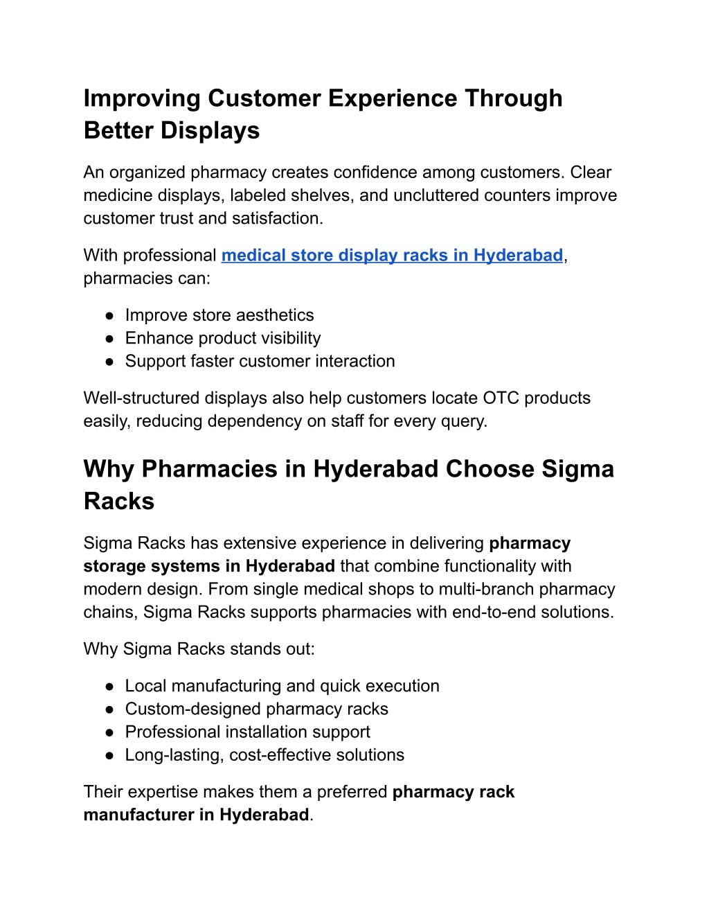 Improving Customer Experience Through Better Displays An organized pharmacy creates confidence among customers. Clear medicine displays, labeled shelves, and uncluttered counters improve customer trust and satisfaction. With professional medical store display racks in Hyderabad, pharmacies can: ● Improve store aesthetics ● Enhance product visibility ● Support faster customer interaction Well-structured displays also help customers locate OTC products easily, reducing dependency on staff for every query. Why Pharmacies in Hyderabad Choose Sigma Racks Sigma Racks has extensive experience in delivering pharmacy storage systems in Hyderabad that combine functionality with modern design. From single medical shops to multi-branch pharmacy chains, Sigma Racks supports pharmacies with end-to-end solutions. Why Sigma Racks stands out: ● Local manufacturing and quick execution ● Custom-designed pharmacy racks ● Professional installation support ● Long-lasting, cost-effective solutions Their expertise makes them a preferred pharmacy rack manufacturer in Hyderabad.