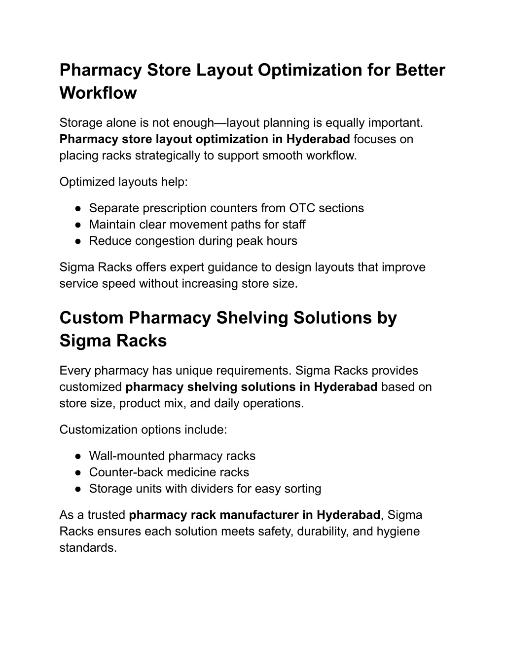 Future-Ready Pharmacy Storage Solutions As pharmacies expand into wellness products, diagnostics, and online order fulfillment, storage needs continue to grow. Modular and space-saving pharmacy racks ensure pharmacies stay future-ready without frequent renovations. Sigma Racks helps pharmacies prepare for growth by offering scalable retail pharmacy racks in Hyderabad that adapt to changing business demands. Conclusion A well-organized pharmacy is essential for faster service, better inventory control, and improved customer satisfaction. By investing in space saving pharmacy storage in Hyderabad, pharmacies can optimize their layout, speed up operations, and create a professional retail environment. With expert-designed pharmacy display racks in Hyderabad, Sigma Racks continues to support medical stores in delivering efficient, organized, and future-ready pharmacy spaces. ? Call us today +91 9670777737/9538060000 for your store setup requirements! ? www.sigmadisplayracks.com / www.sigmastorage.com