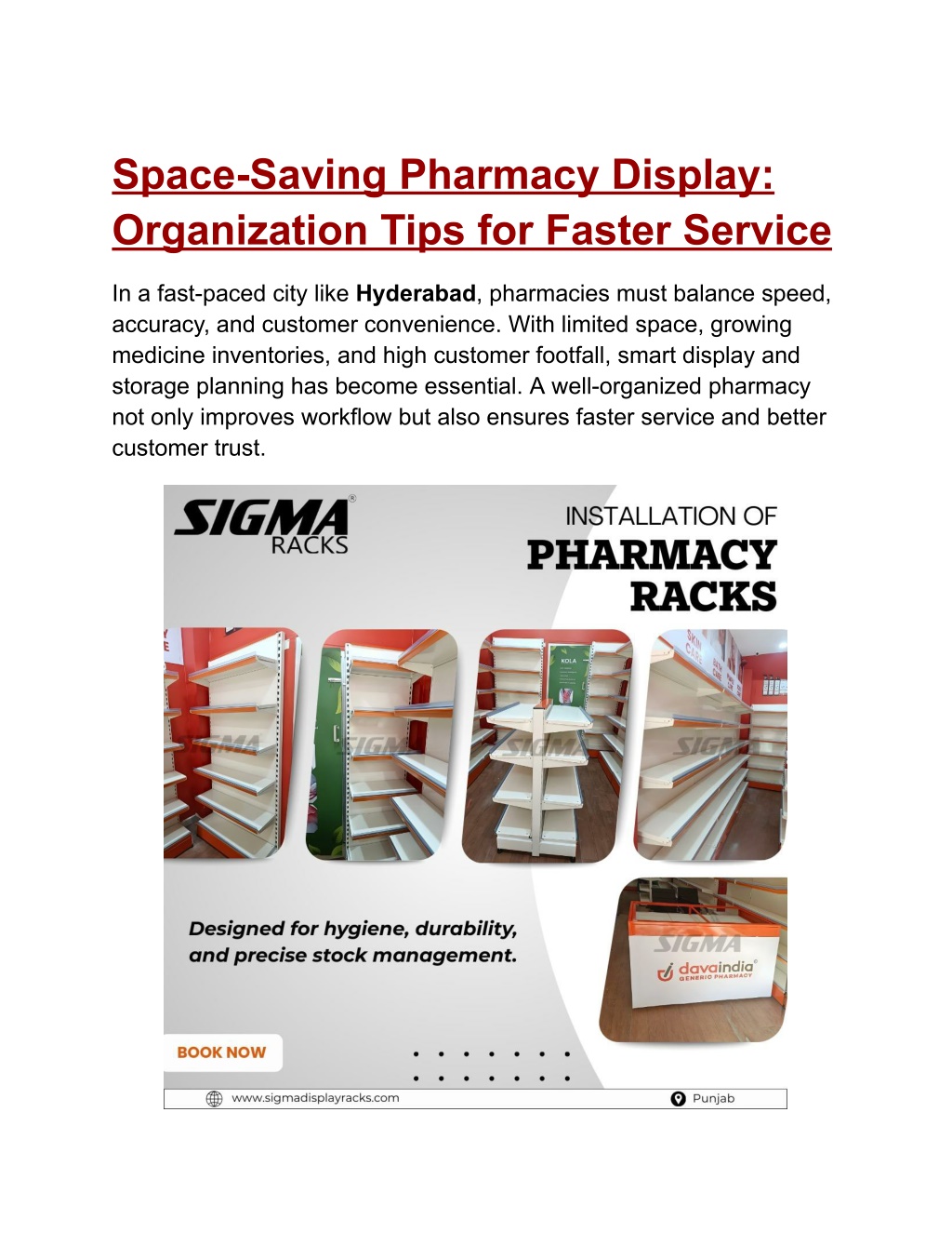 Space-Saving Pharmacy Display: Organization Tips for Faster Service, explains how the right pharmacy display racks and storage systems can improve workflow and reduce customer waiting time. From modular pharmacy shelving solutions to optimized store layouts, Sigma Racks helps medical stores maximize space while maintaining a clean and professional look. Discover how space-saving pharmacy storage can boost efficiency, improve product visibility, and enhance customer satisfaction. <br>https://sigmadisplayracks.com/blog/space-saving-pharmacy-display-organization-tips-for-faster-service