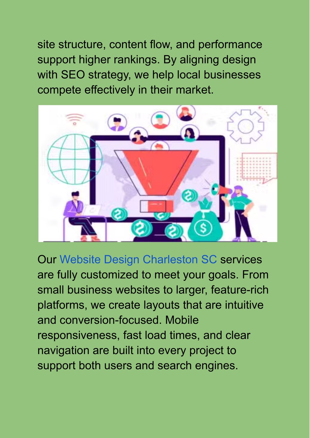 2. site structure, content flow, and performance support higher rankings. By aligning design with SEO strategy, we help local businesses compete effectively in their market. Our Website Design Charleston SC services are fully customized to meet your goals. From small business websites to larger, feature-rich platforms, we create layouts that are intuitive and conversion-focused. Mobile responsiveness, fast load times, and clear navigation are built into every project to support both users and search engines.
