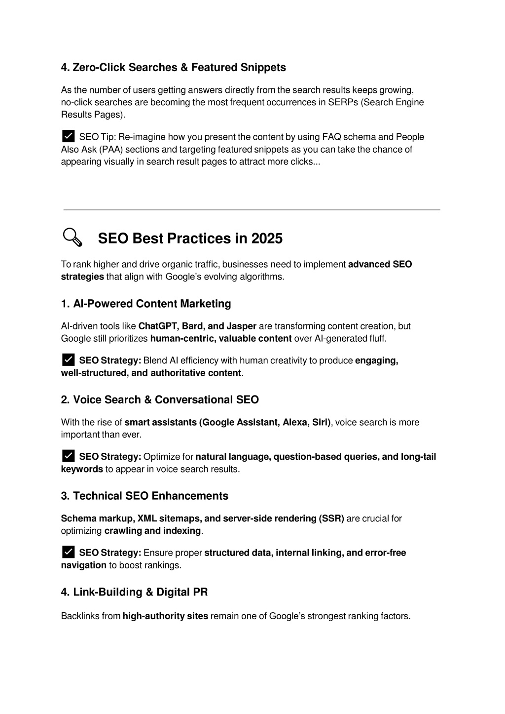 4.Zero-ClickSearches&FeaturedSnippets Asthenumberofusersgettinganswersdirectlyfromthesearchresultskeepsgrowing,no-clicksearchesarebecomingthemostfrequentoccurrencesinSERPs(SearchEngine ResultsPages). ✅SEOTip:Re-imaginehowyoupresentthecontentbyusingFAQschemaandPeople AlsoAsk(PAA)sectionsandtargetingfeaturedsnippetsasyoucantakethechanceof appearingvisuallyinsearchresultpagestoattractmoreclicks... 🔍SEOBestPracticesin2025 Torankhigheranddriveorganictraffic,businessesneedtoimplementadvanced SEO strategiesthatalignwithGoogle’sevolvingalgorithms. AI-PoweredContentMarketing AI-driventoolslikeChatGPT,Bard,andJasperaretransformingcontentcreation,but Googlestillprioritizeshuman-centric,valuablecontentoverAI-generatedfluff. ✅SEOStrategy:BlendAIefficiencywithhumancreativitytoproduceengaging, well-structured,andauthoritativecontent. VoiceSearch&ConversationalSEO Withtheriseofsmartassistants(GoogleAssistant,Alexa,Siri),voicesearchismore importantthanever. ✅SEOStrategy:Optimizefornaturallanguage,question-basedqueries,andlong-tail keywordstoappearinvoicesearchresults. TechnicalSEOEnhancements Schemamarkup,XMLsitemaps,andserver-siderendering(SSR)arecrucialfor optimizingcrawlingandindexing. ✅SEOStrategy:Ensureproperstructureddata,internallinking,anderror-free navigationtoboost rankings. Link-Building&DigitalPR Backlinksfromhigh-authoritysitesremainoneofGoogle’sstrongestrankingfactors.