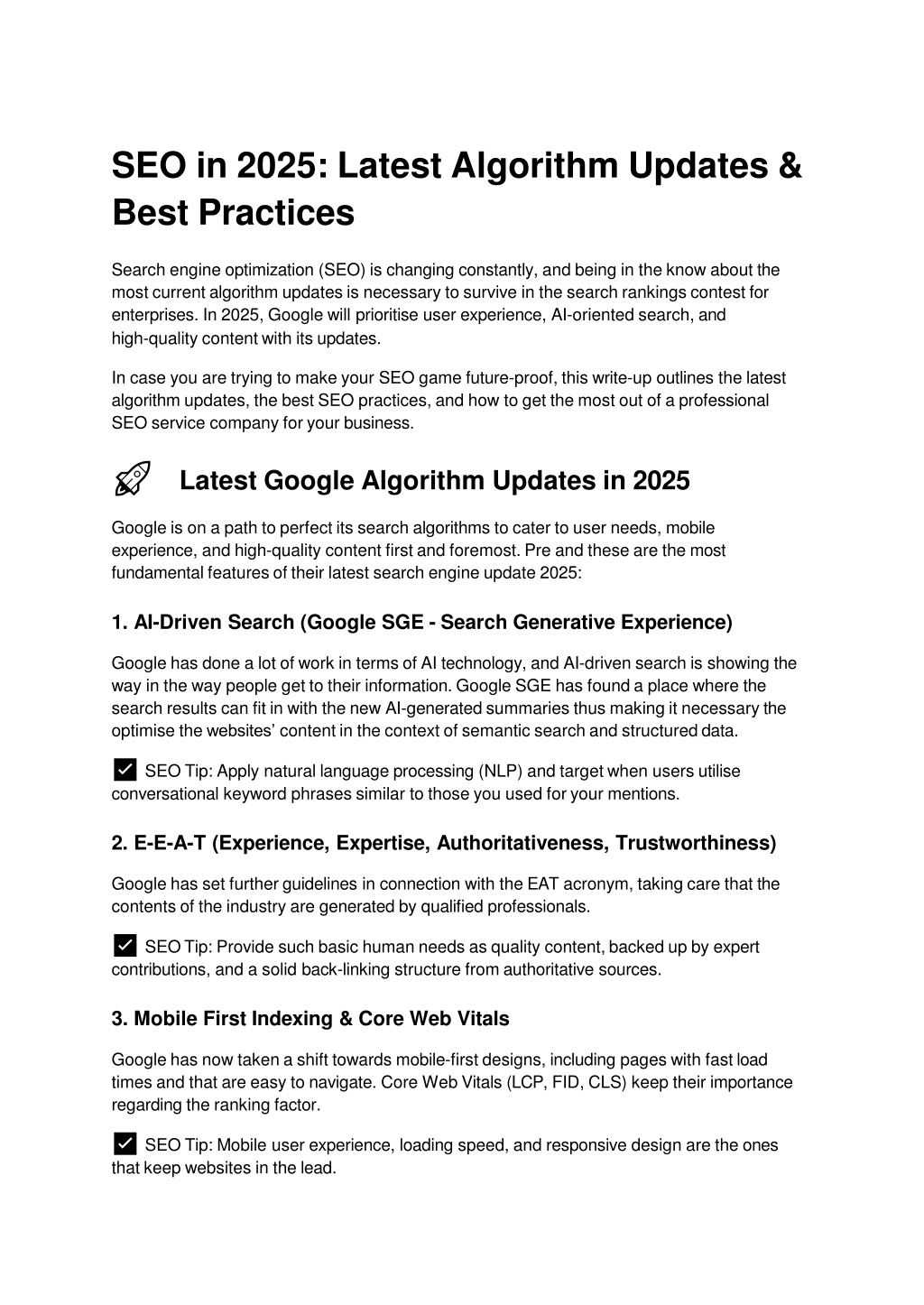SEOin2025:LatestAlgorithmUpdates& BestPractices Searchengineoptimization(SEO)ischangingconstantly,andbeingintheknowaboutthe mostcurrentalgorithmupdatesisnecessarytosurviveinthesearchrankingscontestfor enterprises.In2025,Googlewillprioritiseuserexperience,AI-orientedsearch, and high-qualitycontentwithitsupdates. IncaseyouaretryingtomakeyourSEOgamefuture-proof,thiswrite-upoutlinesthelatest algorithmupdates,thebestSEOpractices,andhowtogetthemostoutofaprofessional SEOservicecompanyforyourbusiness. 🚀LatestGoogleAlgorithmUpdatesin2025 Googleisonapathtoperfectitssearchalgorithmstocatertouserneeds,mobile experience,andhigh-qualitycontentfirstandforemost.Preandthesearethemost fundamentalfeaturesoftheirlatestsearchengineupdate2025: AI-DrivenSearch(GoogleSGE-SearchGenerativeExperience) GooglehasdonealotofworkintermsofAItechnology,andAI-drivensearchisshowingthe wayinthewaypeoplegettotheirinformation.GoogleSGEhasfoundaplacewherethe searchresultscanfitinwiththenewAI-generatedsummariesthusmakingitnecessarythe optimisethewebsites’contentinthecontextofsemanticsearchandstructureddata. ✅SEOTip:Applynaturallanguageprocessing(NLP)andtargetwhenusersutilise conversationalkeywordphrasessimilartothoseyouusedforyourmentions. E-E-A-T (Experience,Expertise, Authoritativeness,Trustworthiness) Googlehassetfurtherguidelinesinconnectionwiththe EAT acronym,takingcarethatthe contentsoftheindustryaregeneratedbyqualifiedprofessionals. ✅SEOTip:Providesuchbasichumanneedsasqualitycontent,backedupbyexpert contributions,andasolid back-linkingstructurefromauthoritative sources. MobileFirstIndexing&CoreWebVitals Googlehasnowtakenashifttowardsmobile-firstdesigns,includingpageswithfastload timesandthatareeasytonavigate.CoreWebVitals (LCP, FID,CLS)keeptheirimportance regardingtherankingfactor. ✅SEOTip:Mobileuserexperience,loadingspeed,andresponsivedesignaretheones thatkeepwebsitesinthelead.