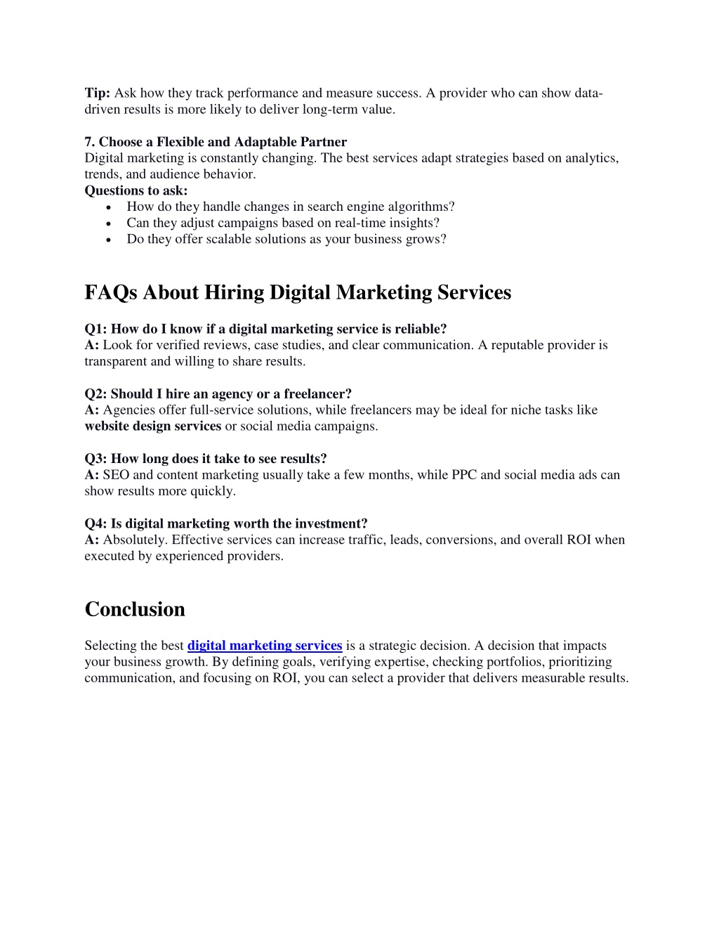 Tip: Ask how they track performance and measure success. A provider who can show data- driven results is more likely to deliver long-term value. 7. Choose a Flexible and Adaptable Partner Digital marketing is constantly changing. The best services adapt strategies based on analytics, trends, and audience behavior. Questions to ask: How do they handle changes in search engine algorithms? Can they adjust campaigns based on real-time insights? Do they offer scalable solutions as your business grows? FAQs About Hiring Digital Marketing Services Q1: How do I know if a digital marketing service is reliable? A: Look for verified reviews, case studies, and clear communication. A reputable provider is transparent and willing to share results. Q2: Should I hire an agency or a freelancer? A: Agencies offer full-service solutions, while freelancers may be ideal for niche tasks like website design services or social media campaigns. Q3: How long does it take to see results? A: SEO and content marketing usually take a few months, while PPC and social media ads can show results more quickly. Q4: Is digital marketing worth the investment? A: Absolutely. Effective services can increase traffic, leads, conversions, and overall ROI when executed by experienced providers. Conclusion Selecting the best digital marketing services is a strategic decision. A decision that impacts your business growth. By defining goals, verifying expertise, checking portfolios, prioritizing communication, and focusing on ROI, you can select a provider that delivers measurable results.