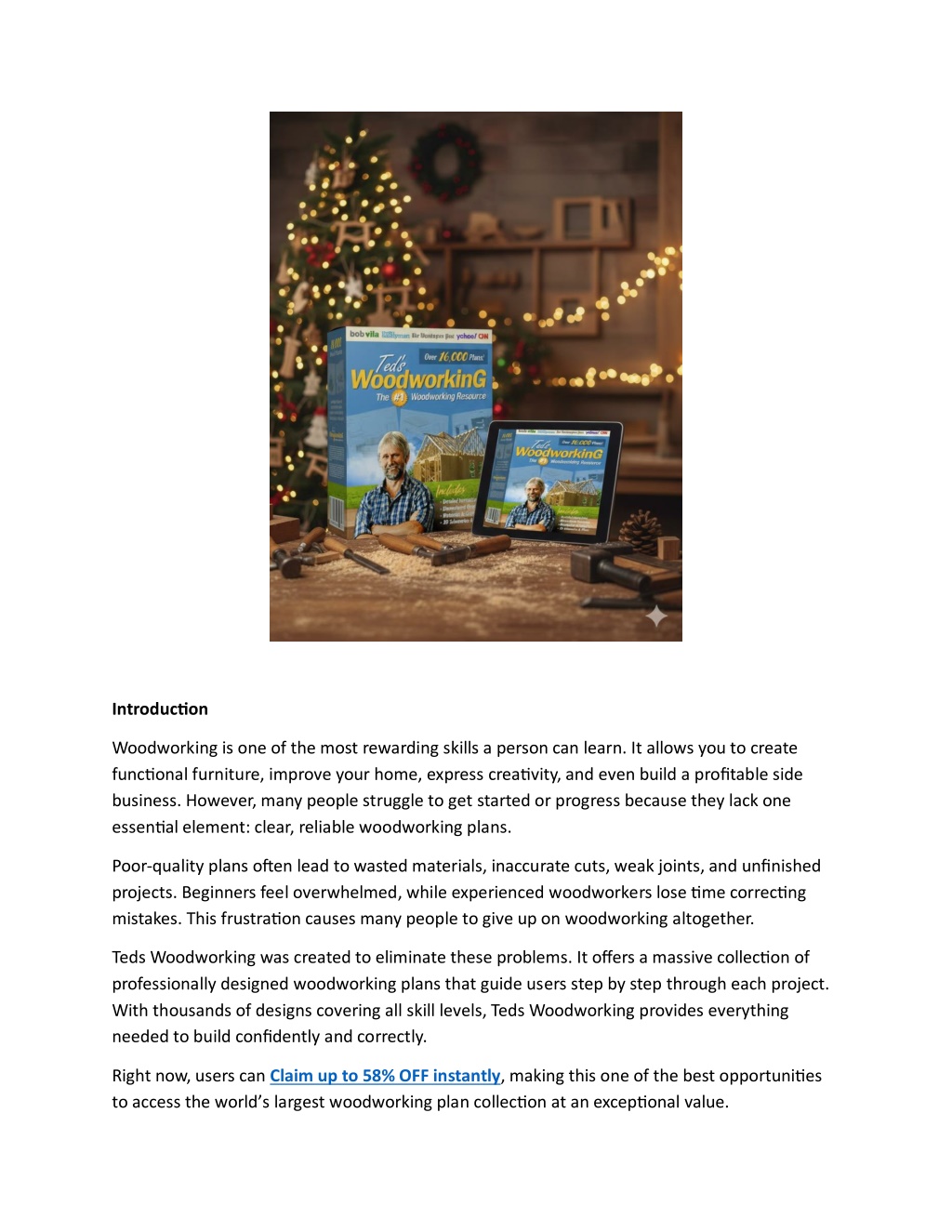 Why Teds Woodworking Is So Popular Teds Woodworking continues to grow in popularity because it consistently delivers results. Massive plan collection Clear instructions Trusted creator Long-term value Suitable for all skill levels The opportunity Claim up to 58% OFF instantlyhas made the program even more attractive to new users. Long-Term Value of Teds Woodworking Unlike single-use plans, Teds Woodworking provides lasting value. Over time, users benefit from: Endless project ideas Continuous skill improvement Reduced material waste Increased creativity Personal satisfaction The program becomes a permanent woodworking reference. Common Mistakes Teds Woodworking Helps Avoid Many woodworking failures happen due to poor planning. Teds Woodworking helps prevent: Incorrect measurements Weak joints Structural instability