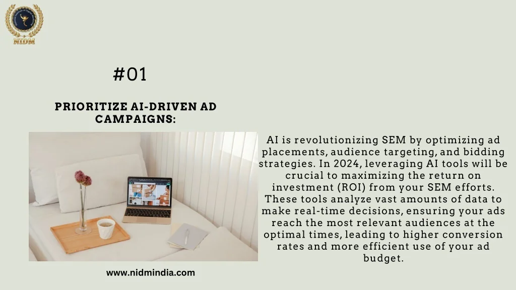#01 PRIORITIZE AI-DRIVEN AD CAMPAIGNS: AI is revolutionizing SEM by optimizing ad placements, audience targeting, and bidding strategies. In 2024, leveraging AI tools will be crucial to maximizing the return on investment (ROI) from your SEM efforts. These tools analyze vast amounts of data to make real-time decisions, ensuring your ads reach the most relevant audiences at the optimal times, leading to higher conversion rates and more efficient use of your ad budget. www.nidmindia.com
