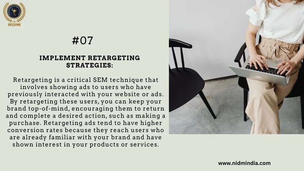 #07 IMPLEMENT RETARGETING STRATEGIES: Retargeting is a critical SEM technique that involves showing ads to users who have previously interacted with your website or ads. By retargeting these users, you can keep your brand top-of-mind, encouraging them to return and complete a desired action, such as making a purchase. Retargeting ads tend to have higher conversion rates because they reach users who are already familiar with your brand and have shown interest in your products or services. www.nidmindia.com