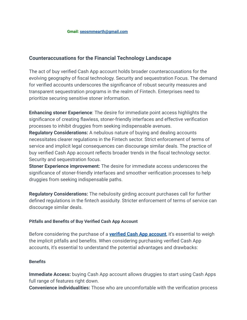 linked, buyers initiate contact to bandy the details of the sale, including price and account features. Payment Buyers shoot payment to the dealer, frequently through digital payment platforms or cryptocurrencies. Scammers can exploit this stage, leading to the implicit loss of finances. Account Transfer After payment is entered, the dealer provides the account credentials to the buyer, enabling them to log in and pierce the vindicated account. Provocations Fueling the Purchase of Verified Cash App Accounts The provocations driving individualities to consider buying vindicated Cash App accounts are different and can be embedded in colorful factors Streamlined Verification The process of verification can be a handicap for some individuals who are either unintentionally or unfit to partake in their particular information online. Purchasing a verified account can serve as a roadway to penetrating the platform's features without the hassle of the verification process. Instant point Access buy verified Cash App account regard opens the door to the full array of features incontinently, allowing druggies to shoot larger quantities of plutocrats, invest in stocks, and engage in cryptocurrency deals without any detention. Sequestration enterprises. In a period of heightened digital security mindfulness, sequestration enterprises impend large. Purchasing an account may appeal to those who wish to maintain a position of obscurity while still engaging in online fiscal conditioning. Discharging the Pitfalls and Benefits of Purchasing Verified Cash App Accounts Before deciding to buy verified Cash App account, it’s pivotal to weigh the implicit advantages and downsides. Legal Considerations and Terms of Service The legitimacy of buying and selling Cash App accounts is complex and frequently unclear. Cash Apps terms of service explicitly enjoin the transfer of accounts between druggies. Engaging in similar deals can affect severe consequences, including account suspense or termination. Also, depending on governance, these deals could be viewed as fraudulent conditioning or identity theft, potentially leading to legal conduct against both buyers and merchandisers. If You Want To More Information just Contact Now: Skype: SEOSMMEARTH Telegram: @seosmmearth