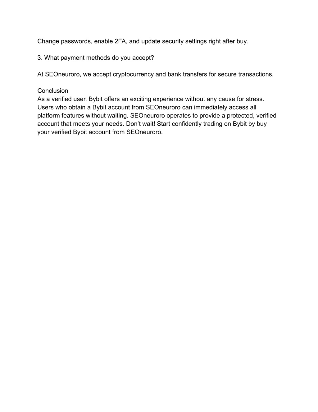 Change passwords, enable 2FA, and update security settings right after buy. 3. What payment methods do you accept? At SEOneuroro, we accept cryptocurrency and bank transfers for secure transactions. Conclusion As a verified user, Bybit offers an exciting experience without any cause for stress. Users who obtain a Bybit account from SEOneuroro can immediately access all platform features without waiting. SEOneuroro operates to provide a protected, verified account that meets your needs. Don’t wait! Start confidently trading on Bybit by buy your verified Bybit account from SEOneuroro.