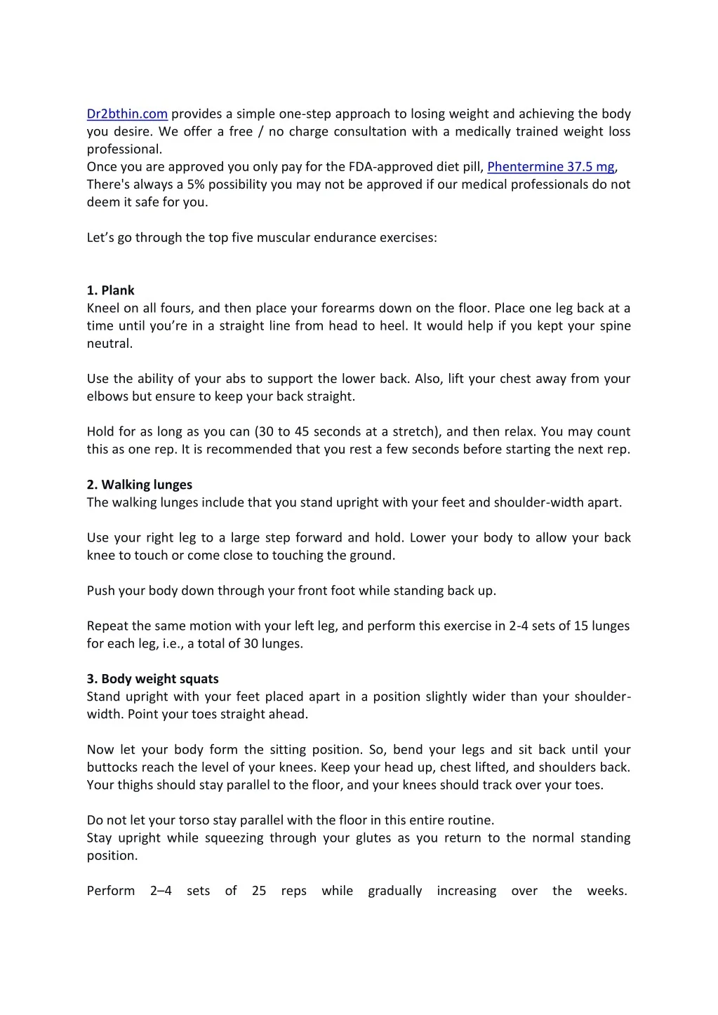 Dr2bthin.com provides a simple one-step approach to losing weight and achieving the body you desire. We offer a free / no charge consultation with a medically trained weight loss professional. Once you are approved you only pay for the FDA-approved diet pill, Phentermine 37.5 mg, There's always a 5% possibility you may not be approved if our medical professionals do not deem it safe for you. Let’s go through the top five muscular endurance exercises: 1. Plank Kneel on all fours, and then place your forearms down on the floor. Place one leg back at a time until you’re in a straight line from head to heel. It would help if you kept your spine neutral. Use the ability of your abs to support the lower back. Also, lift your chest away from your elbows but ensure to keep your back straight. Hold for as long as you can (30 to 45 seconds at a stretch), and then relax. You may count this as one rep. It is recommended that you rest a few seconds before starting the next rep. 2. Walking lunges The walking lunges include that you stand upright with your feet and shoulder-width apart. Use your right leg to a large step forward and hold. Lower your body to allow your back knee to touch or come close to touching the ground. Push your body down through your front foot while standing back up. Repeat the same motion with your left leg, and perform this exercise in 2-4 sets of 15 lunges for each leg, i.e., a total of 30 lunges. 3. Body weight squats Stand upright with your feet placed apart in a position slightly wider than your shoulder- width. Point your toes straight ahead. Now let your body form the sitting position. So, bend your legs and sit back until your buttocks reach the level of your knees. Keep your head up, chest lifted, and shoulders back. Your thighs should stay parallel to the floor, and your knees should track over your toes. Do not let your torso stay parallel with the floor in this entire routine. Stay upright while squeezing through your glutes as you return to the normal standing position. Perform 2–4 sets of 25 reps while gradually increasing over the weeks.