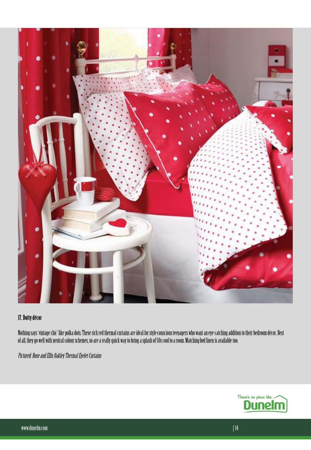 www.dunelm.com | 14 17. Dotty décor Nothing says ‘vintage chic’ like polka dots. These rich red thermal curtains are ideal for style-conscious teenagers who want an eye-catching addition to their bedroom décor. Best of all, they go well with neutral colour schemes, so are a really quick way to bring a splash of 50s cool to a room. Matching bed linen is available too. Pictured: Rose and Ellis Oakley Thermal Eyelet Curtains