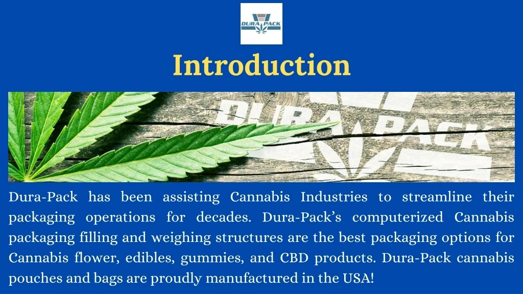 Introduction Dura-Pack has been assisting Cannabis Industries to streamline their packaging operations for decades. Dura-Pack’s computerized Cannabis packaging filling and weighing structures are the best packaging options for Cannabis flower, edibles, gummies, and CBD products. Dura-Pack cannabis pouches and bags are proudly manufactured in the USA!