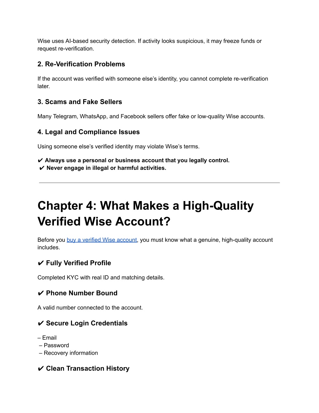 Wise uses AI-based security detection. If activity looks suspicious, it may freeze funds or request re-verification. 2. Re-Verification Problems If the account was verified with someone else’s identity, you cannot complete re-verification later. 3. Scams and Fake Sellers Many Telegram, WhatsApp, and Facebook sellers offer fake or low-quality Wise accounts. 4. Legal and Compliance Issues Using someone else’s verified identity may violate Wise’s terms. ✔Always use a personal or business account that you legally control. ✔Never engage in illegal or harmful activities. Chapter 4: What Makes a High-Quality Verified Wise Account? Before you buy a verified Wise account, you must know what a genuine, high-quality account includes. ✔ Fully Verified Profile Completed KYC with real ID and matching details. ✔ Phone Number Bound A valid number connected to the account. ✔ Secure Login Credentials – Email – Password – Recovery information ✔ Clean Transaction History