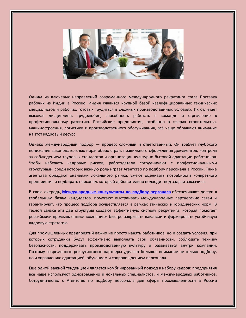 Одним из ключевых направлений современного международного рекрутинга стала Поставка рабочих из Индии в Россию. Индия славится крупной базой квалифицированных технических специалистов и рабочих, готовых трудиться в сложных производственных условиях. Их отличает высокая дисциплина, трудолюбие, способность работать в команде и стремление к профессиональному развитию. Российские предприятия, особенно в сферах строительства, машиностроения, логистики и производственного обслуживания, всё чаще обращают внимание на этот кадровый ресурс. Однако международный подбор—процесс сложный и ответственный. Он требует глубокого понимания законодательных норм обеих стран, правильного оформления документов, контроля за соблюдением трудовых стандартов и организации культурно-бытовой адаптации работников. Чтобы избежать кадровых рисков, работодатели сотрудничают с профессиональными структурами, среди которых важную роль играет Агентство по подбору персонала в России. Такие агентства обладают знаниями локального рынка, умеют оценивать потребности конкретного предприятия и подбирать персонал, который действительно подходит под задачи заказчика. В свою очередь,Международные консультанты по подбору персоналаобеспечивают доступ к глобальным базам кандидатов, помогают выстраивать международные партнерские связи и гарантируют, что процесс подбора осуществляется в рамках этических и юридических норм. В тесной связке эти две структуры создают эффективную систему рекрутинга, которая помогает российским промышленным компаниям быстро закрывать вакансии и формировать устойчивую кадровую стратегию. Для промышленных предприятий важно не просто нанять работников, но и создать условия, при которых сотрудники будут эффективно выполнять свои обязанности,соблюдать технику безопасности, поддерживать производственную культуру и развиваться внутри компании. Поэтому современные рекрутинговые партнеры уделяют большое внимание не только подбору, но и управлению адаптацией, обучением и сопровождением персонала. Еще одной важной тенденцией является комбинированный подход к набору кадров: предприятия все чаще используют одновременно и локальных специалистов, и международных работников. Сотрудничество с Агентство по подбору персонала для сферы промышленности в России