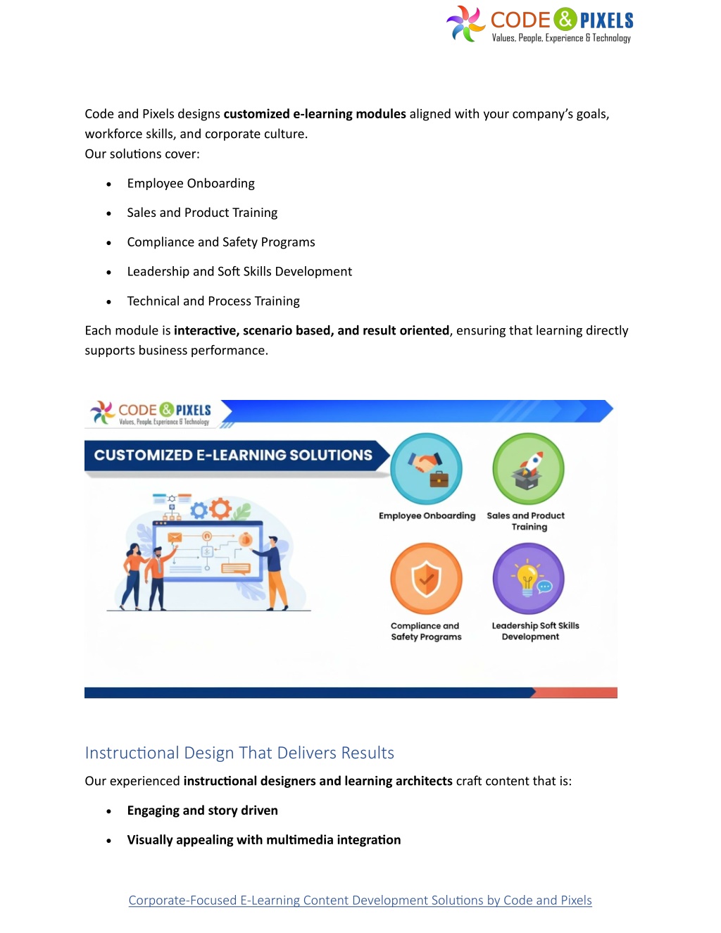 Code and Pixels Interactive Technologies Pvt. Ltd. delivers end-to-end corporate e-learning content development solutions that make training faster, measurable, and impactful. <br>With deep expertise in instructional design, multimedia, and LMS integration, we create customized, SCORM/xAPI-compliant modules for: <br>u2022 Onboarding & Induction Corporate-Focused E-Learning Content Development Solutions by Code and Pixels <br>u2022 Compliance & Safety <br>u2022 Sales & Product Training <br>u2022 Soft Skills & Leadership <br>Our in house team ensures rapid delivery, consistency, and cost efficiency helping businesses transform
