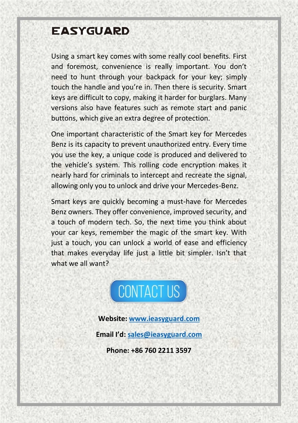 Using a smart key comes with some really cool benefits. First and foremost, convenience is really important. You don’t need to hunt through your backpack for your key; simply touch the handle and you’re in. Then there is security. Smart keys are difficult to copy, making it harder for burglars. Many versions also have features such as remote start and panic buttons, which give an extra degree of protection. One important characteristic of the Smart key for Mercedes Benz is its capacity to prevent unauthorized entry. Every time you use the key, a unique code is produced and delivered to the vehicle’s system. This rolling code encryption makes it nearly hard for criminals to intercept and recreate the signal, allowing only you to unlock and drive your Mercedes-Benz. Smart keys are quickly becoming a must-have for Mercedes Benz owners. They offer convenience, improved security, and a touch of modern tech. So, the next time you think about your car keys, remember the magic of the smart key. With just a touch, you can unlock a world of ease and efficiency that makes everyday life just a little bit simpler. Isn’t that what we all want? Website: www.ieasyguard.com Email I’d: sales@ieasyguard.com Phone: +86 760 2211 3597