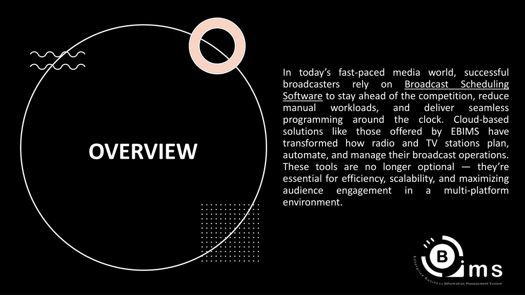 OVERVIEW In today’s fast-paced media world, successful broadcasters rely on Broadcast Scheduling Software to stay ahead of the competition, reduce manual workloads, and deliver seamless programming around the clock. Cloud-based solutions like those offered by EBIMS have transformed how radio and TV stations plan, automate, and manage their broadcast operations. These tools are no longer optional — they’re essential for efficiency, scalability, and maximizing audience engagement in a multi-platform environment.