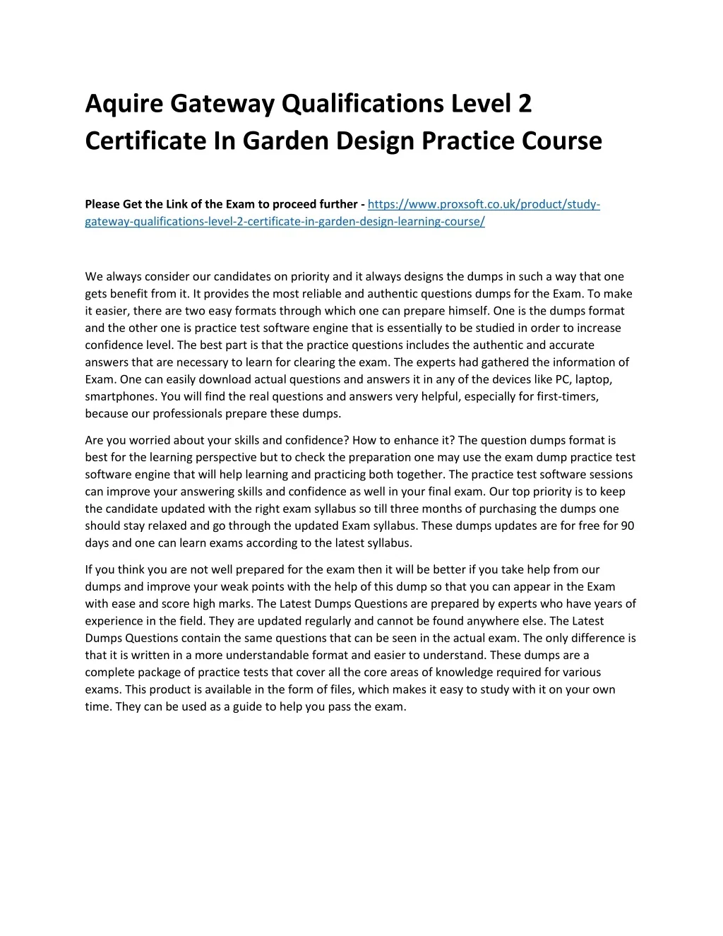 Aquire Gateway Qualifications Level 2 Certificate In Garden Design Practice Course Please Get the Link of the Exam to proceed further - https://www.proxsoft.co.uk/product/study- gateway-qualifications-level-2-certificate-in-garden-design-learning-course/ We always consider our candidates on priority and it always designs the dumps in such a way that one gets benefit from it. It provides the most reliable and authentic questions dumps for the Exam. To make it easier, there are two easy formats through which one can prepare himself. One is the dumps format and the other one is practice test software engine that is essentially to be studied in order to increase confidence level. The best part is that the practice questions includes the authentic and accurate answers that are necessary to learn for clearing the exam. The experts had gathered the information of Exam. One can easily download actual questions and answers it in any of the devices like PC, laptop, smartphones. You will find the real questions and answers very helpful, especially for first-timers, because our professionals prepare these dumps. Are you worried about your skills and confidence? How to enhance it? The question dumps format is best for the learning perspective but to check the preparation one may use the exam dump practice test software engine that will help learning and practicing both together. The practice test software sessions can improve your answering skills and confidence as well in your final exam. Our top priority is to keep the candidate updated with the right exam syllabus so till three months of purchasing the dumps one should stay relaxed and go through the updated Exam syllabus. These dumps updates are for free for 90 days and one can learn exams according to the latest syllabus. If you think you are not well prepared for the exam then it will be better if you take help from our dumps and improve your weak points with the help of this dump so that you can appear in the Exam with ease and score high marks. The Latest Dumps Questions are prepared by experts who have years of experience in the field. They are updated regularly and cannot be found anywhere else. The Latest Dumps Questions contain the same questions that can be seen in the actual exam. The only difference is that it is written in a more understandable format and easier to understand. These dumps are a complete package of practice tests that cover all the core areas of knowledge required for various exams. This product is available in the form of files, which makes it easy to study with it on your own time. They can be used as a guide to help you pass the exam.