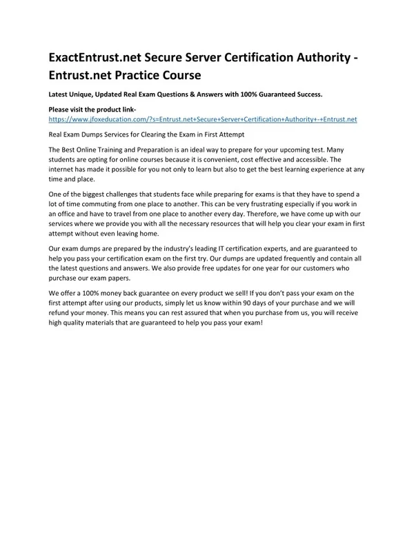 ExactEntrust.net Secure Server Certification Authority - Entrust.net Practice Course Latest Unique, Updated Real Exam Questions & Answers with 100% Guaranteed Success. Please visit the product link- https://www.jfoxeducation.com/?s=Entrust.net+Secure+Server+Certification+Authority+-+Entrust.net Real Exam Dumps Services for Clearing the Exam in First Attempt The Best Online Training and Preparation is an ideal way to prepare for your upcoming test. Many students are opting for online courses because it is convenient, cost effective and accessible. The internet has made it possible for you not only to learn but also to get the best learning experience at any time and place. One of the biggest challenges that students face while preparing for exams is that they have to spend a lot of time commuting from one place to another. This can be very frustrating especially if you work in an office and have to travel from one place to another every day. Therefore, we have come up with our services where we provide you with all the necessary resources that will help you clear your exam in first attempt without even leaving home. Our exam dumps are prepared by the industry's leading IT certification experts, and are guaranteed to help you pass your certification exam on the first try. Our dumps are updated frequently and contain all the latest questions and answers. We also provide free updates for one year for our customers who purchase our exam papers. We offer a 100% money back guarantee on every product we sell! If you don’t pass your exam on the first attempt after using our products, simply let us know within 90 days of your purchase and we will refund your money. This means you can rest assured that when you purchase from us, you will receive high quality materials that are guaranteed to help you pass your exam!