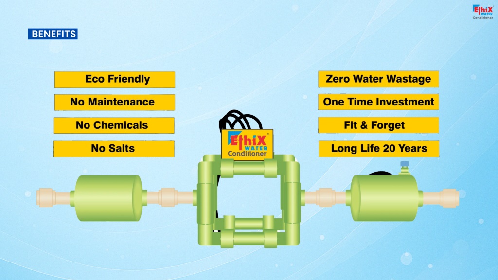This presentation explains how Ethix Water Conditioner helps eliminate hard water problems using advanced, maintenance-free technology. It protects pipelines, geysers, and appliances from scale buildup, improves water quality, and offers an eco-friendly solution for homes, industries, and commercial spaces. Learn how smart water conditioning increases equipment life and reduces maintenance costs.