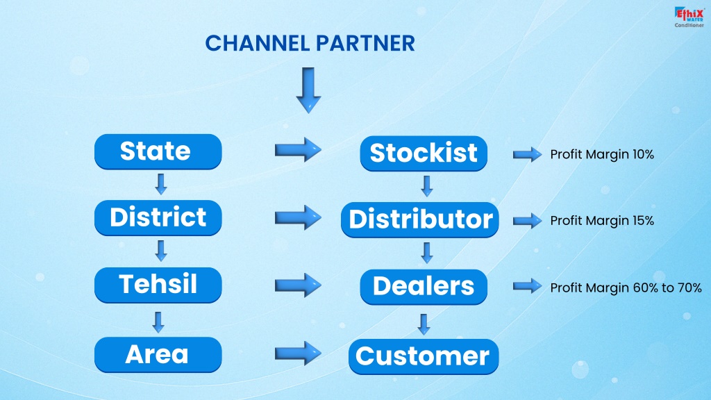 CHANNEL PARTNER State Stockist Profit Margin 10% District Distributor Profit Margin 15% Tehsil Dealers Profit Margin 60% to 70% Area Customer
