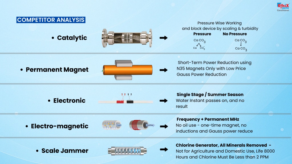 COMPETITOR ANALYSIS Pressure Wise Working and block device by scaling & turbidity Pressure No Pressure Ca CO3 CO- 3 Catalytic Ca CO3 Ca CO3 Ca Short-Term Power Reduction using N35 Magnets Only with Low Price Gauss Power Reduction Permanent Magnet Single Stage / Summer Season Water Instant passes on, and no result Electronic Frequency + Permanent MHz No oil use - one-time magnet, no inductions and Gauss power reduce Electro-magnetic Chlorine Generator, All Minerals Removed - Not for Agriculture and Domestic Use, Life 8000 Hours and Chlorine Must Be Less than 2 PPM Scale Jammer