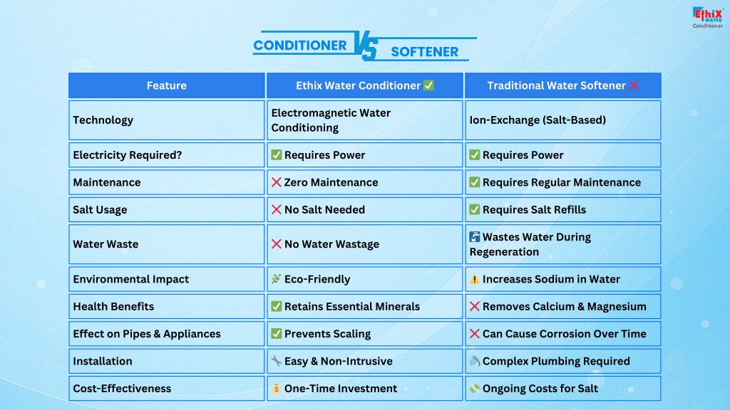 CONDITIONER SOFTENER Feature Ethix Water Conditioner ✅ Traditional Water Softener ❌ Electromagnetic Water Conditioning Technology Ion-Exchange (Salt-Based) Electricity Required? ✅ Requires Power ✅ Requires Power Maintenance ❌ Zero Maintenance ✅ Requires Regular Maintenance Salt Usage ❌ No Salt Needed ✅ Requires Salt Refills ? Wastes Water During Regeneration Water Waste ❌ No Water Wastage Environmental Impact ? Eco-Friendly ⚠ Increases Sodium in Water Health Benefits ✅ Retains Essential Minerals ❌ Removes Calcium & Magnesium Effect on Pipes & Appliances ✅ Prevents Scaling ❌ Can Cause Corrosion Over Time Installation ? Easy & Non-Intrusive ? Complex Plumbing Required Cost-Effectiveness ? One-Time Investment ? Ongoing Costs for Salt