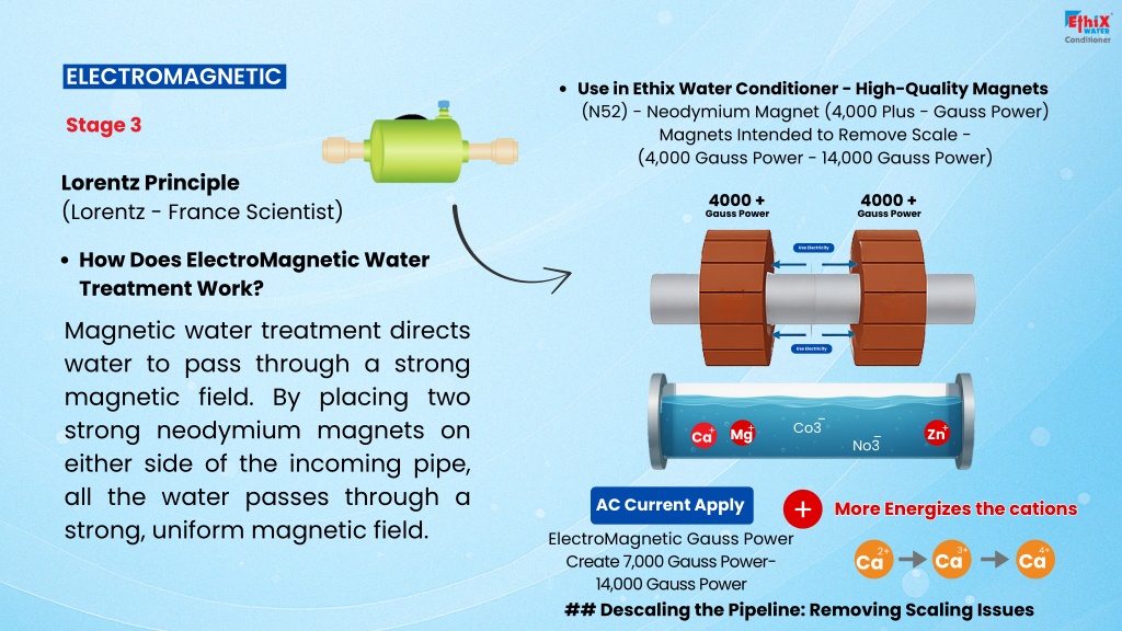 ELECTROMAGNETIC Use in Ethix Water Conditioner - High-Quality Magnets (N52) - Neodymium Magnet (4,000 Plus - Gauss Power) Magnets Intended to Remove Scale - (4,000 Gauss Power - 14,000 Gauss Power) Stage 3 Lorentz Principle (Lorentz - France Scientist) 4000 + Gauss Power 4000 + Gauss Power Use Electricity How Does ElectroMagnetic Water Treatment Work? Magnetic water treatment directs water to pass through a strong magnetic field. By placing two strong neodymium magnets on either side of the incoming pipe, all the water passes through a strong, uniform magnetic field. Use Electricity _ Co3 Mg+ Zn+ _ Ca+ No3 + AC Current Apply MoreEnergizesthecations More Energizes the cations ElectroMagnetic Gauss Power Create 7,000 Gauss Power- 14,000 Gauss Power ## Descaling the Pipeline: Removing Scaling Issues 3+ 4+ 2+ Ca Ca Ca
